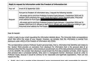 University of Oxford denies request to release emails related to Prof Sunetra Gupta's visit to the United States in October 2020