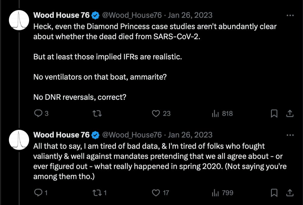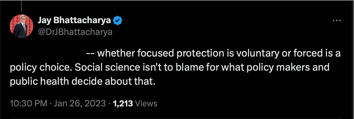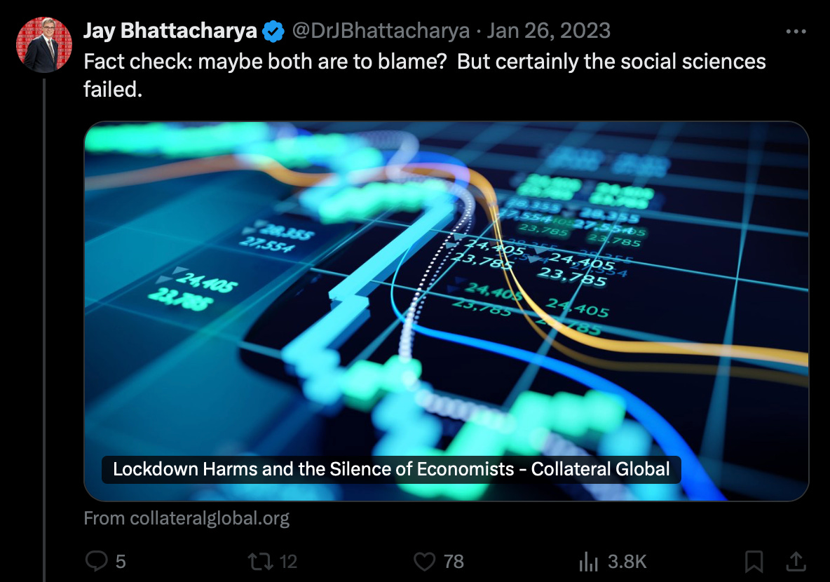 A comment from reader Jeff Fisher on my Sunetra Gupta post this morning reminded me about an exchange between Jay Bhattacharya and myself in late January 2023, roughly one month after my suspended Twitter account had been restored.