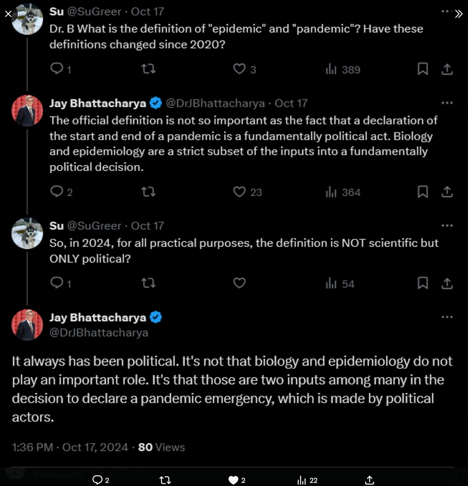 in October 2024 in which Bhattacharya said “the official definition” of pandemic isn’t as important as the nature of a pandemic declaration being a fundamentally political act made by political actors. It’s not clear from this particular interaction what “inputs” from biology & epidemiology he believes are relevant to or inform a pandemic declaration, or if he thinks a pandemic is a distinct observable biological/epidemiological phenomenon, and why.I believe pandemics are NOT observable, demonstrated biological or epidemiological phenomena. Rather, they are creatures of political/social science, tools for economic exploitation, & ways for those in authority to gain or preserve power.1