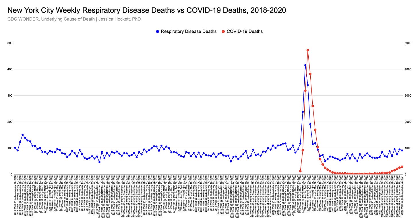 Consider how ridiculous the proposition is: Just as a moderate flu season was winding down, when many of the most vulnerable would have already died or been admitted to the hospital, a pathogen comparable to flu in lethality (if not much lower) strikes and creates a mortality event that exceeds what the city reported in 1918.