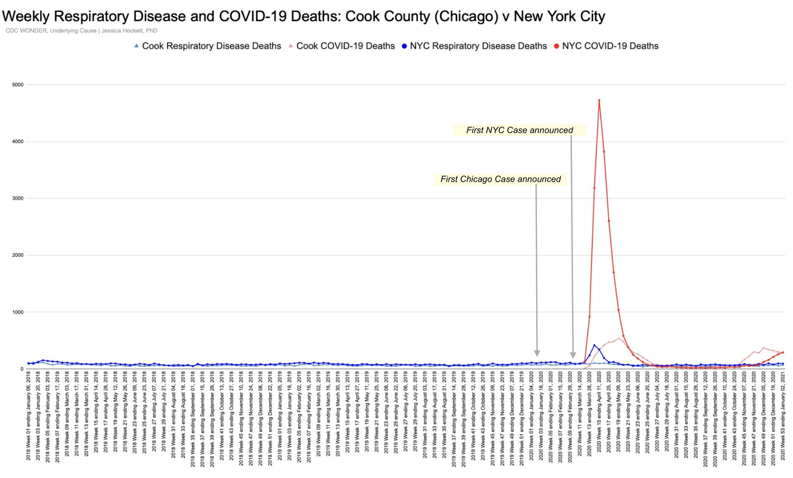 This, of course, begs the question of why New York didn’t tell Chicago (or Los Angeles) how to “handle” The Virus. Even if social distancing and masks stopped airborne respiratory pathogens (which they don’t), as a Cook County resident back then, I can assure you that my fellow citizens dutifully obeyed those and other illogical, illegal orders. So fidelity to non-pharmaceutical interventions can’t be the answer.