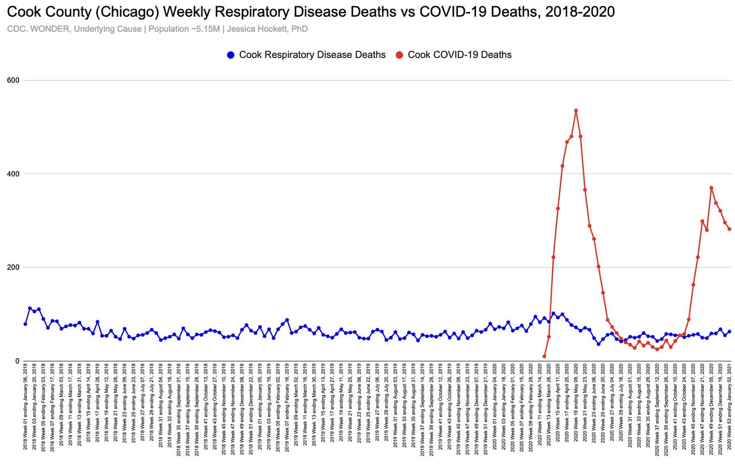 Observe as well that Cook County experienced no non-COVID respiratory disease spike in March and April, but had significant COVID-blamed deaths in the fall and early winter. So COVID was “done with New York” but not with Chicago?