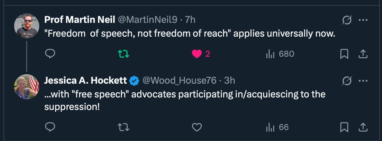 As Martin Neil quipped, riffing on Elon Musk’s November 2022 policy, “‘Freedom of speech, not freedom of reach’ applies universally now.”