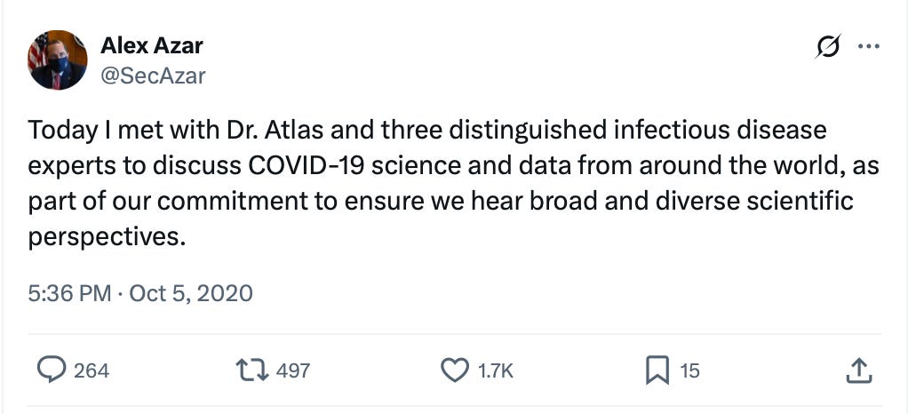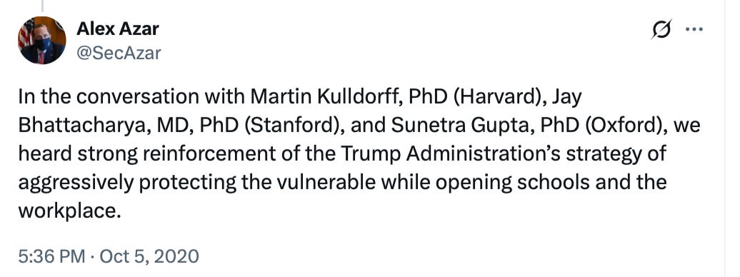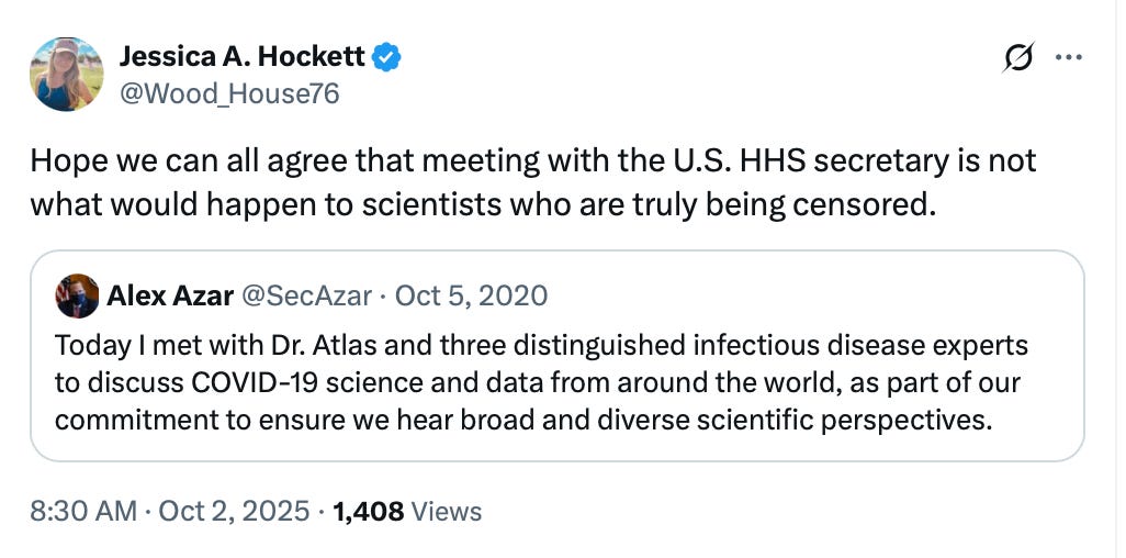 On 2 October 2025, Jessica Hockett posted the following, quoting Alex Azar’s 5 October 2020 tweet about meeting with Dr. Scott Atlas and three infectious disease experts: