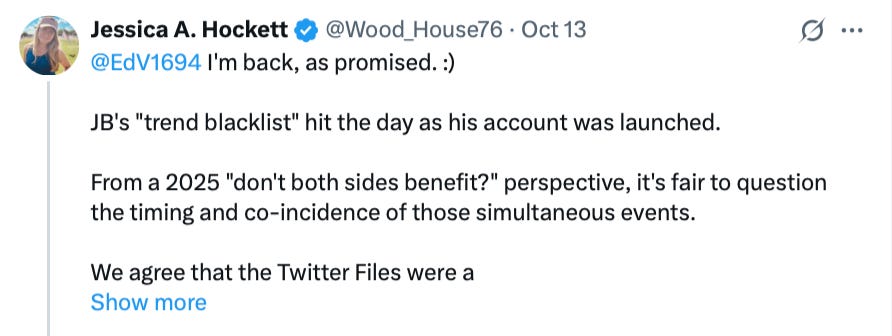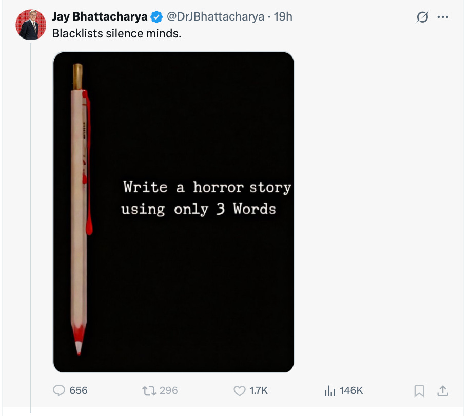 [Jay Bhattacharya’s] ‘trend blacklist’ hit the same day as his account was launched. From a 2025 ‘don’t both sides benefit?’ perspective, it’s fair to question the timing and co-incidence of those simultaneous events.