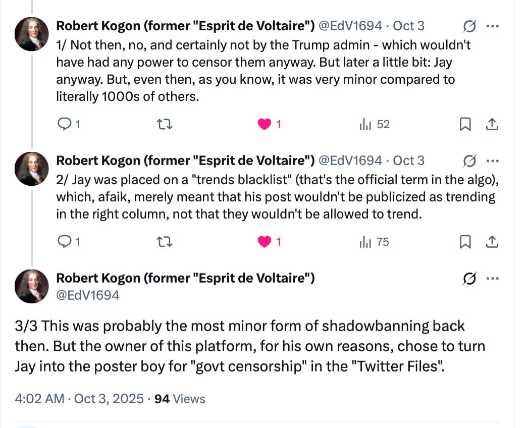 This was probably the most minor form of shadowbanning back then. But the owner of this platform [Elon Musk], for his own reasons, chose to turn Jay into the poster boy for ‘govt censorship’ in the ‘Twitter Files’.”