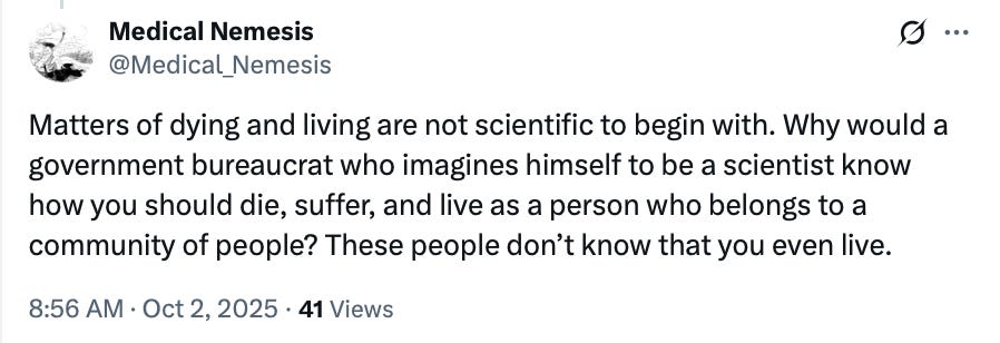 Notably, a separate reply from @Medical_Nemesis (“Matters of dying and living are not scientific to begin with. Why would a government bureaucrat who imagines himself to be a scientist know how you should die, suffer, and live as a person who belongs to a community of people? These people don’t know that you even live.”) was not part of the direct Hockett-Kogon dialogue.