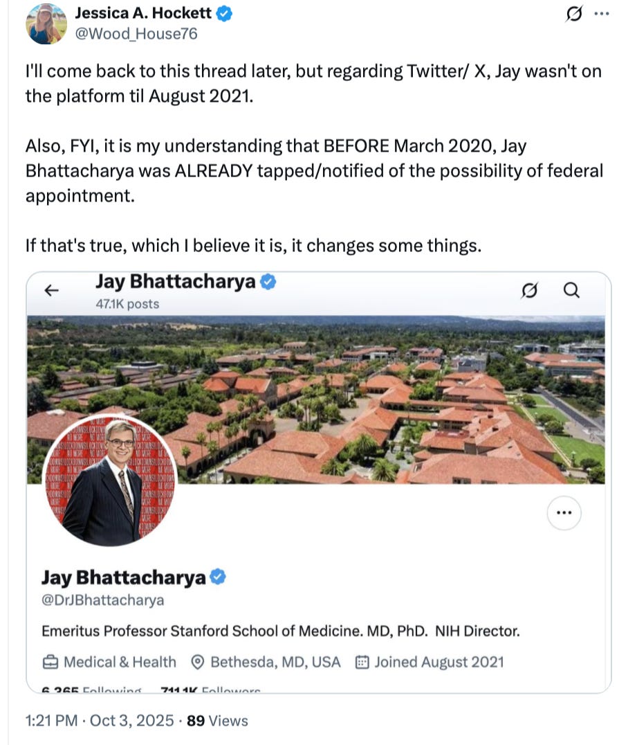 I’ll come back to this thread later, but regarding Twitter/ X, Jay wasn’t on the platform til August 2021. Also, FYI, it is my understanding that BEFORE March 2020, Jay Bhattacharya was ALREADY tapped/notified of the possibility of federal appointment. If that’s true, which I believe it is, it changes some things.