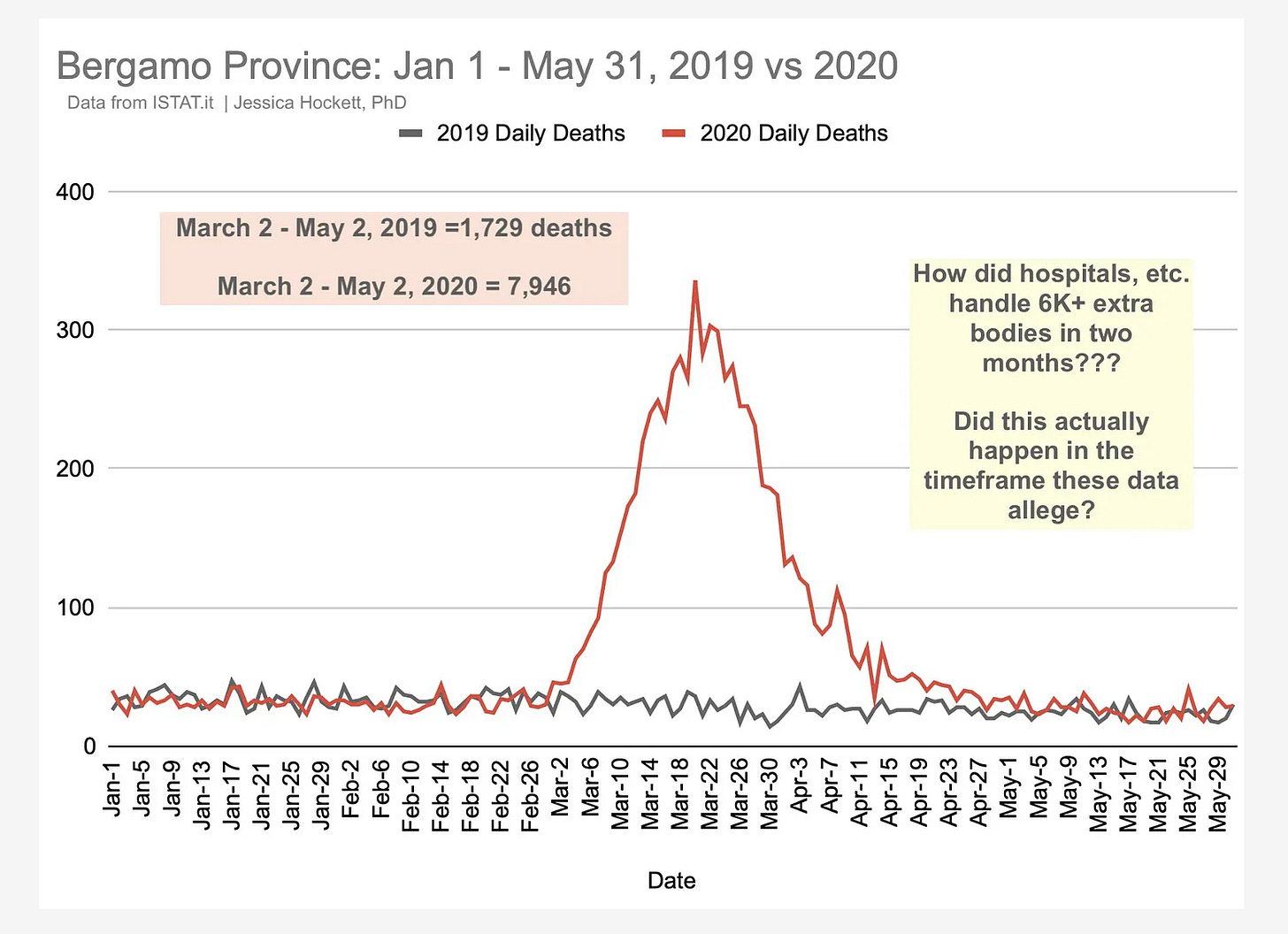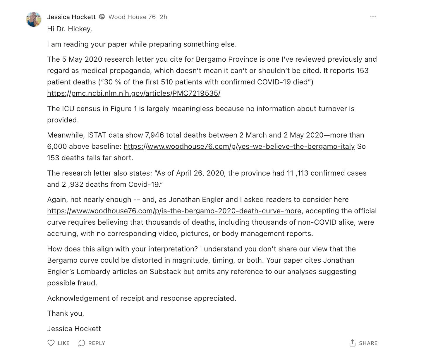and I asked readers to consider here https://www.woodhouse76.com/p/is-the-bergamo-2020-death-curve-more, accepting the official curve requires believing that thousands of deaths, including thousands of non-COVID alike, were accruing, with no corresponding video, pictures, or body management reports.How does this align with your interpretation? I understand you don’t share our view that the Bergamo curve could be distorted in magnitude, timing, or both. Your paper cites Dr. Engler’s Lombardy articles on Substack but omits any reference to our analyses suggesting possible fraud.1