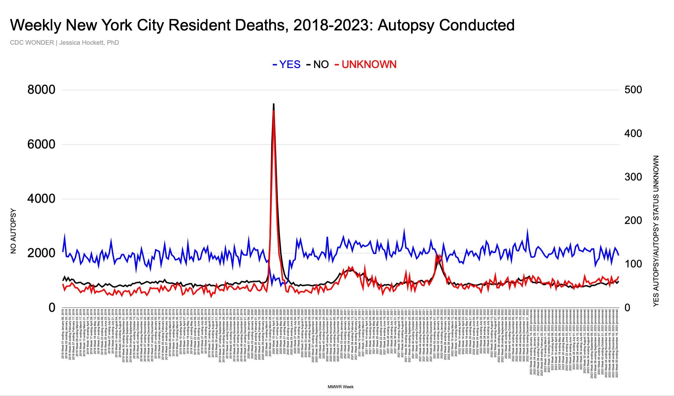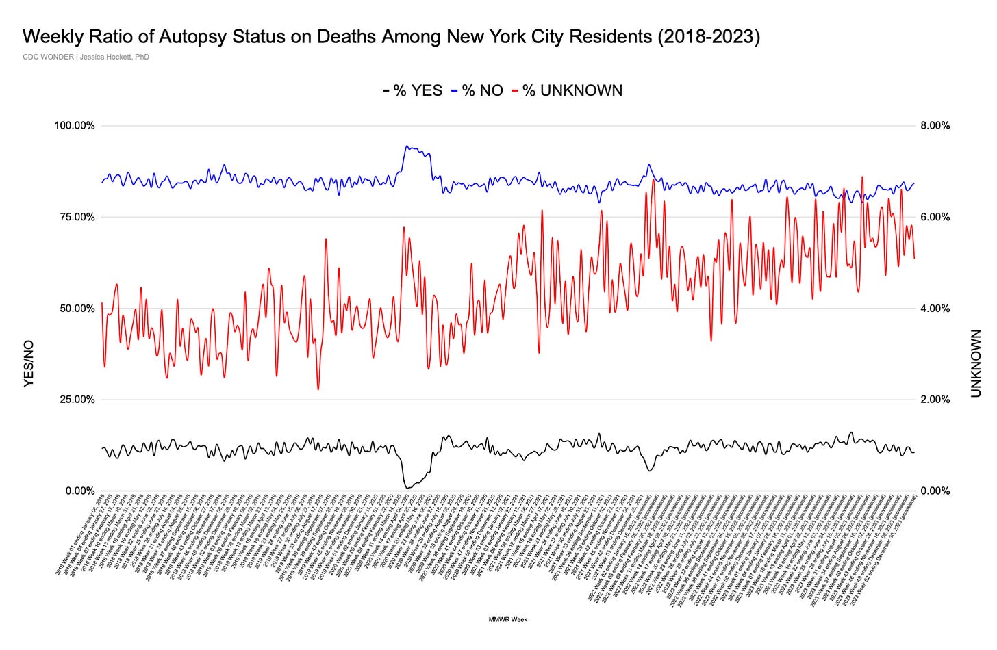 Figure 2: Autopsy Status for New York City Resident Deaths Each Week, Jan 2018-Dec 2023