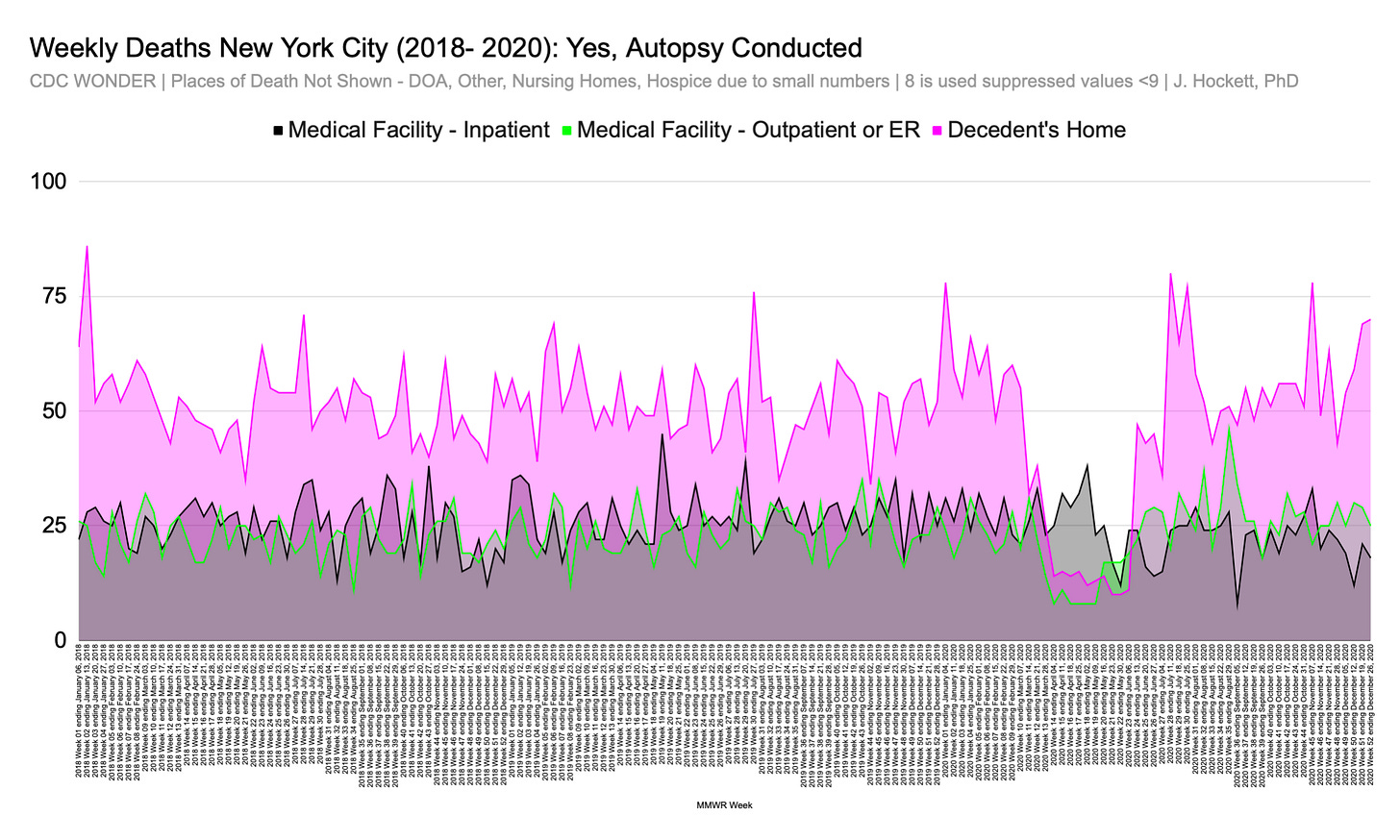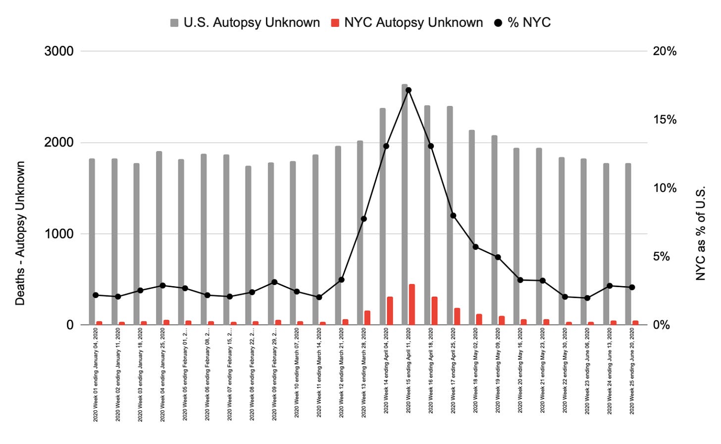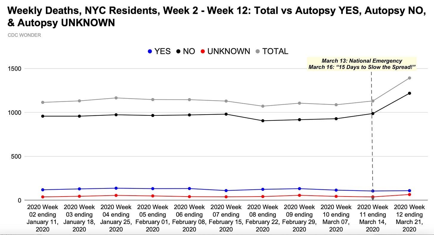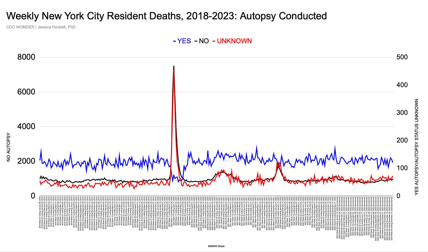 Sudden changes to the number and proportion of autopsies conducted in New York City in spring 2020 raise more questions about what happened during the biggest mass fatality event in city history and why. The disturbing shifts and unusual characteristics in official federal data add to the growing body of circumstantial evidence that authorities are not telling the whole truth about the scale & nature of deaths, or the movement and treatment of bodies during the fatality spike.