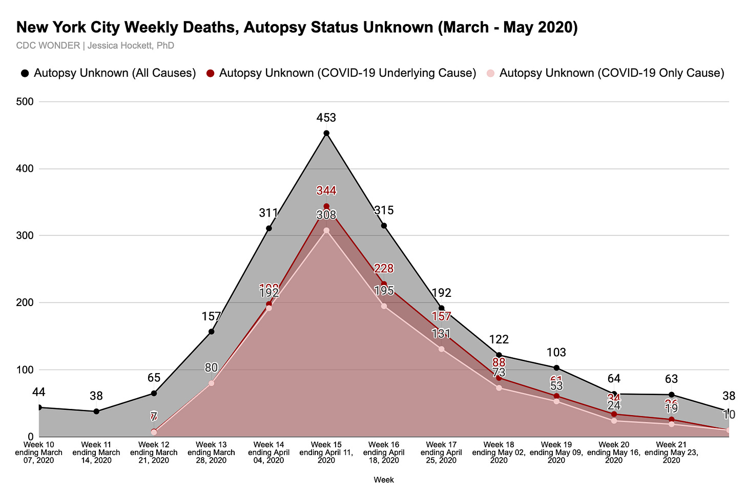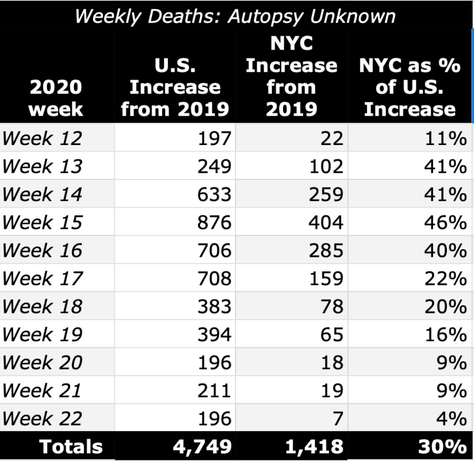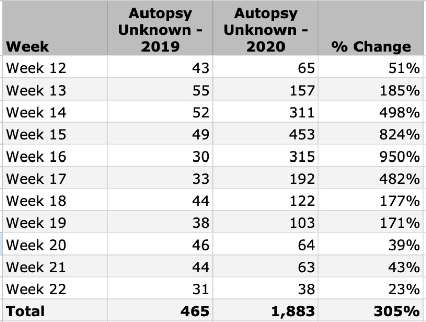 There were 432 autopsy unknown deaths during weeks 12-22 in 2019, versus 1,883 in the same weeks in 2020, for a 305% increase (Table 3).