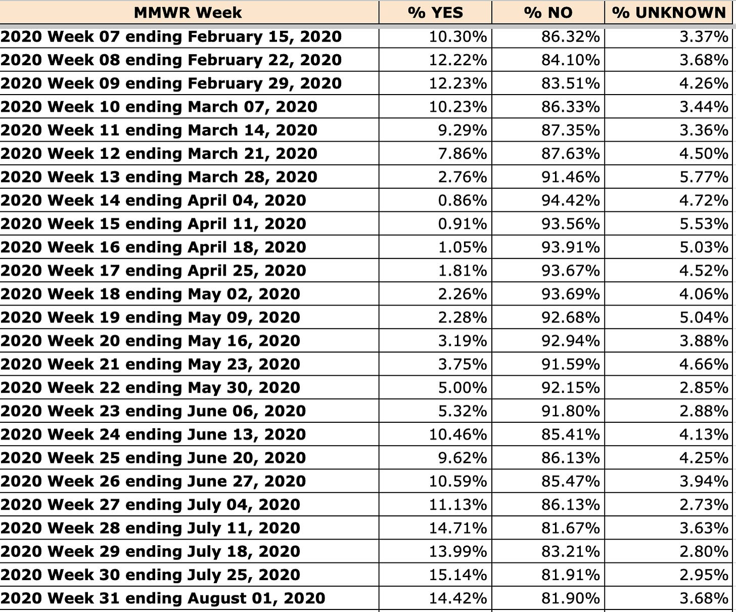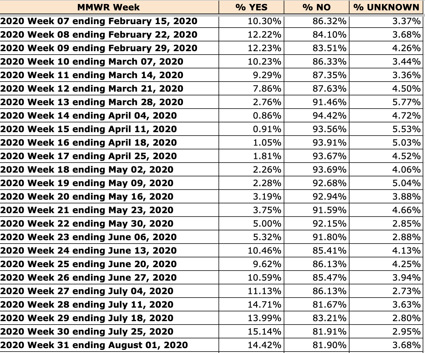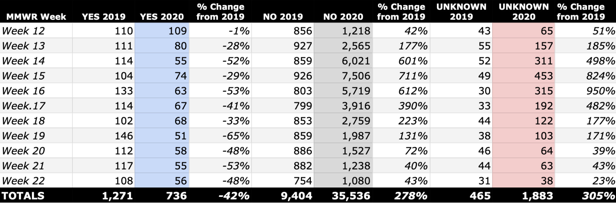 Table 1 shows the weekly raw numbers and percent change for weeks 12-22 in 2019 compared to 2020. Unknown rose slightly faster than no and peaked in the same week. Overall percent change from 2019 was higher for unknown than it was for no (305% vs 278%). Yes declined by one-third to two-thirds from baseline each weekly, with the steepest drop occurring later in the event (65% in Week 19).