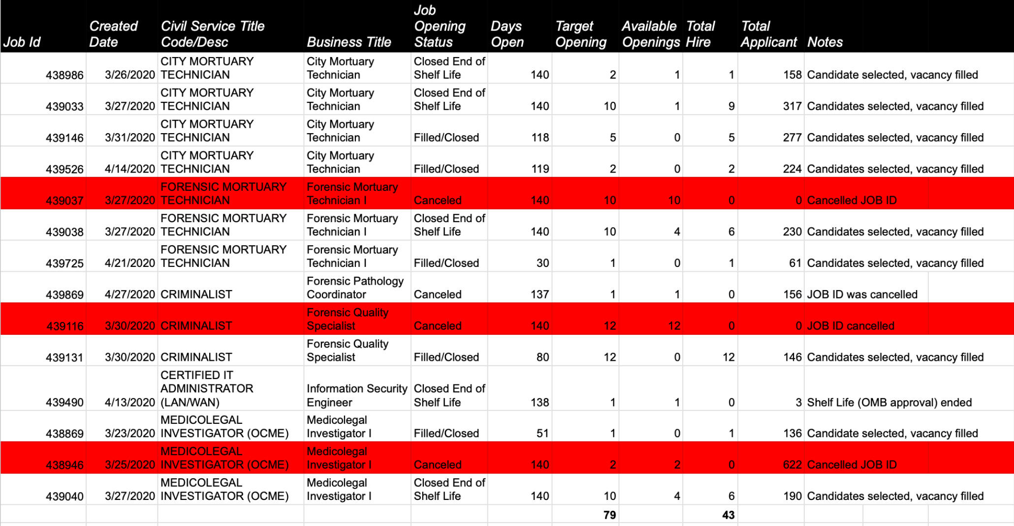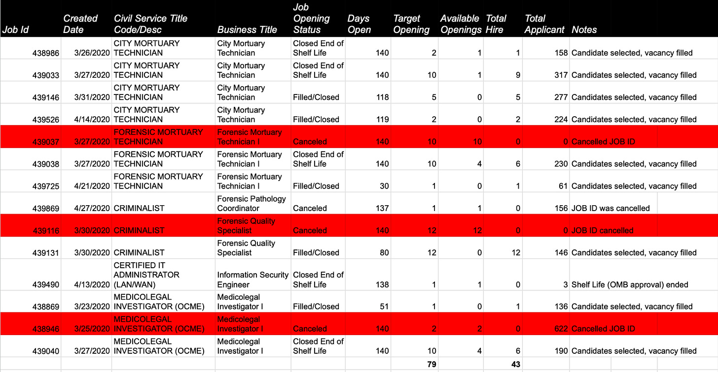 Records I obtained from OCME show jobs were posted. Some openings weren’t fulfilled to “target” despite a high number of applicants, some were canceled, and others remained open for months and were never completely filled. (Records requested from the NYC Officer of the Medical Examiner on December 8, 2023, and received on May 17, 2024.)