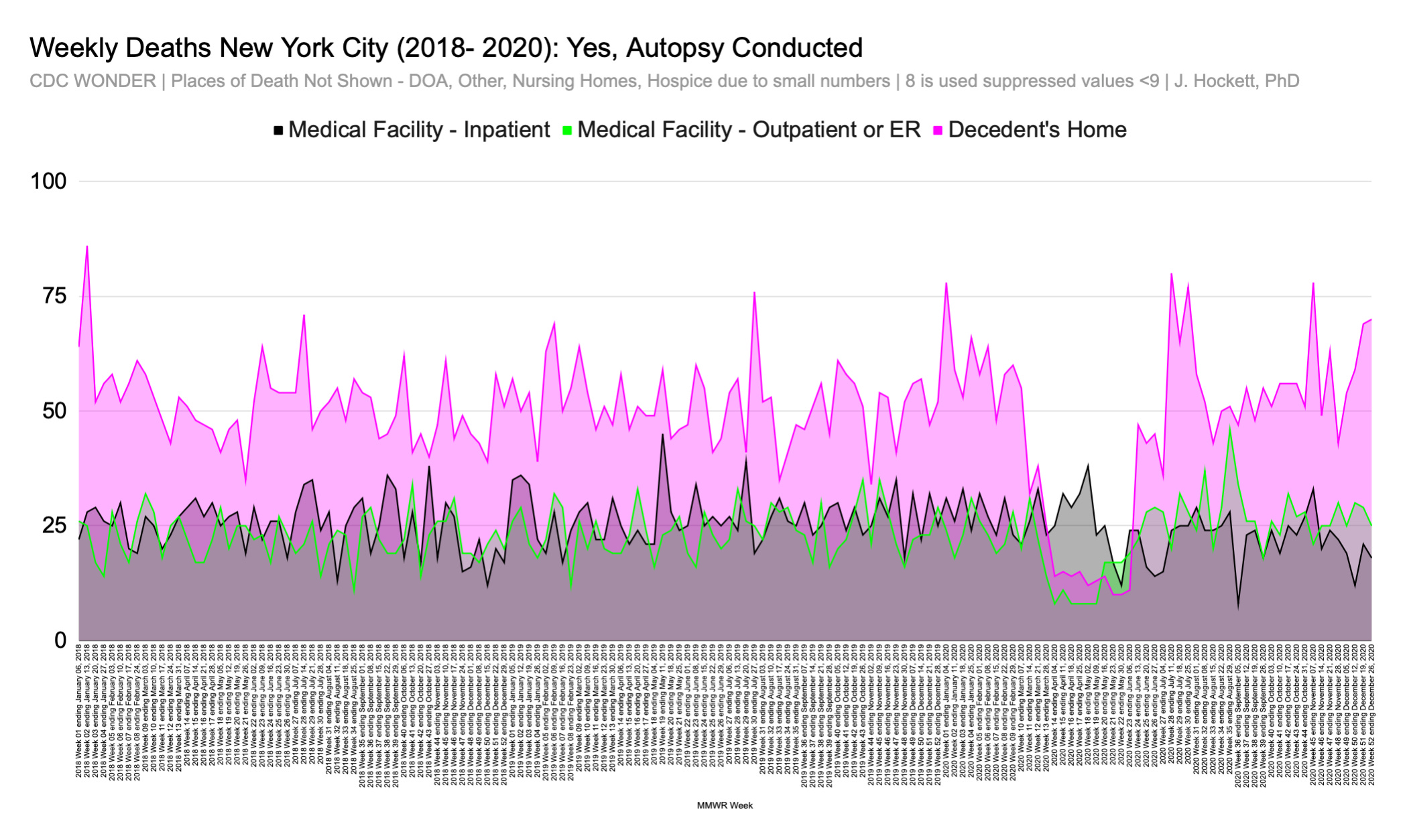 Figure 5: Weekly Deaths Among NYC Residents Occurring in Hospital Inpatient, Emergency Dept/Outpatient, and Home for Which an Autopsy Was Conducted, Jan 2018 - December 2020