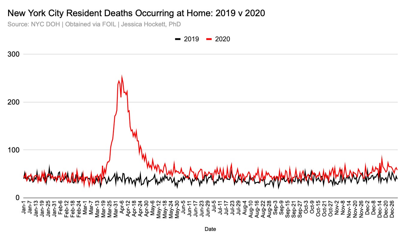 NYPD units show up to all incidents involving a person who dies on the scene. My records requests for the daily number of calls involving NYPD coming to the scene where someone had died is now months overdue, but an NYPD detective I spoke with said a) he saw no National Guard removing bodies from homes and b) medicolegal investigators from the OCME had stopped showing up to calls involving a person pronounced dead on the scene roughly two weeks into the emergency period (~very end of March beginning of April).6 He also questioned the legitimacy of the home death spike and said it was inconsistent with his experience in spring 2020.