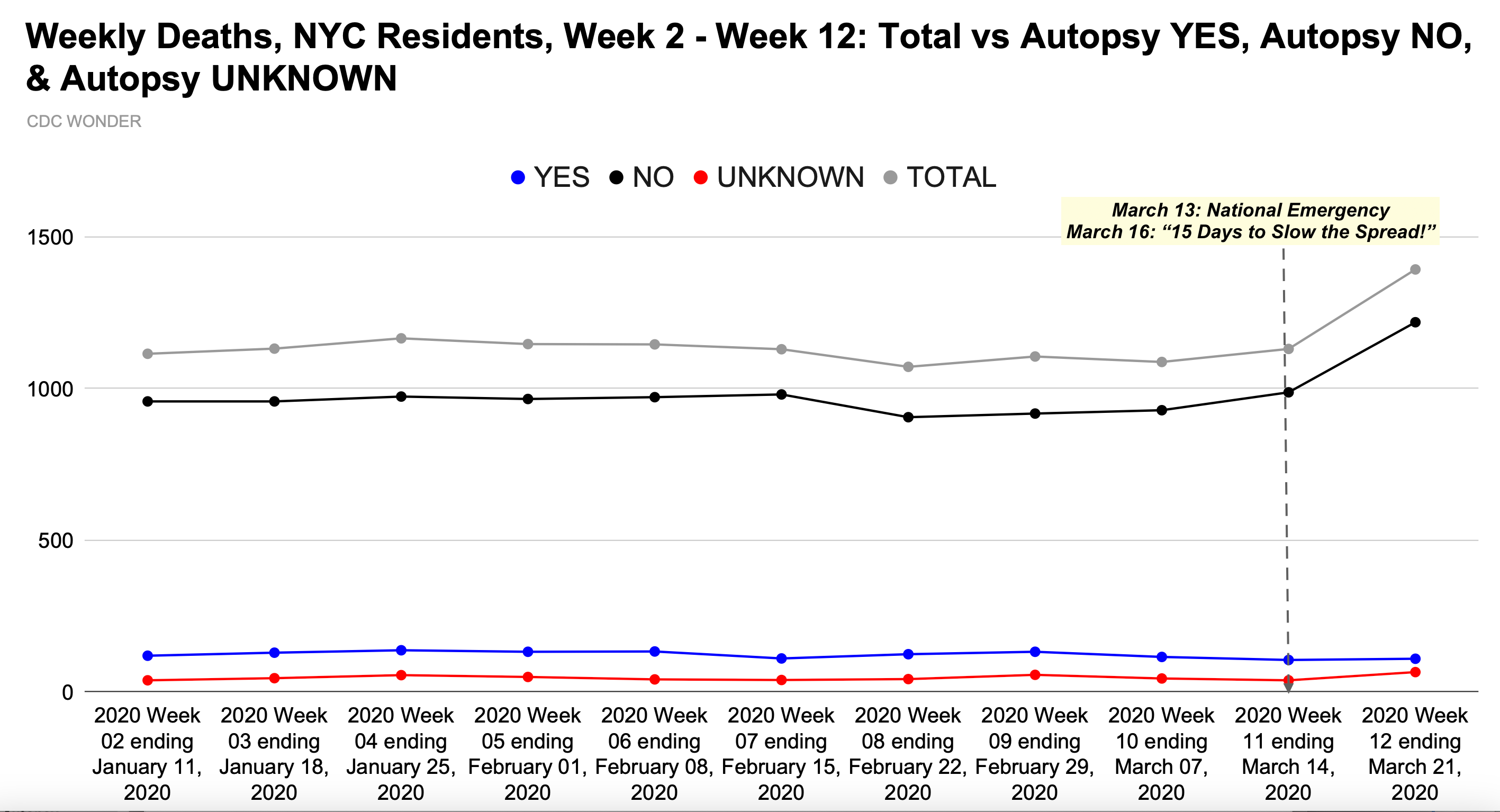 Figure 1: Autopsy Status of New York City resident deaths occurring weekly in weeks 2-12, 2020