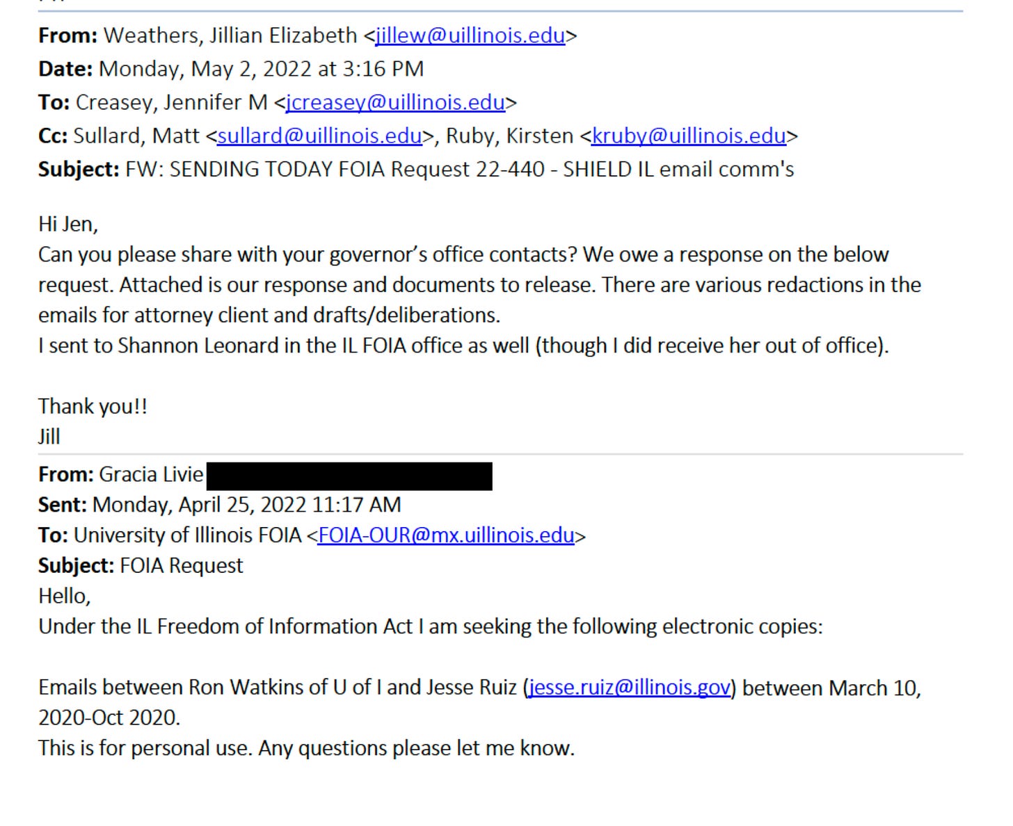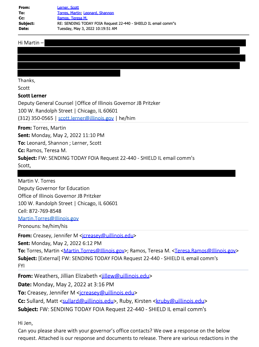 Little did she know, before the U of I sent her the documents, senior FOIA officer Jillian Weathers had sent them to Shannon Learned, who handles FOIA requests to the Governor’s office, and to Jennifer Creasy, Senior Director of State Relations in U of I’s governmental relations office.*