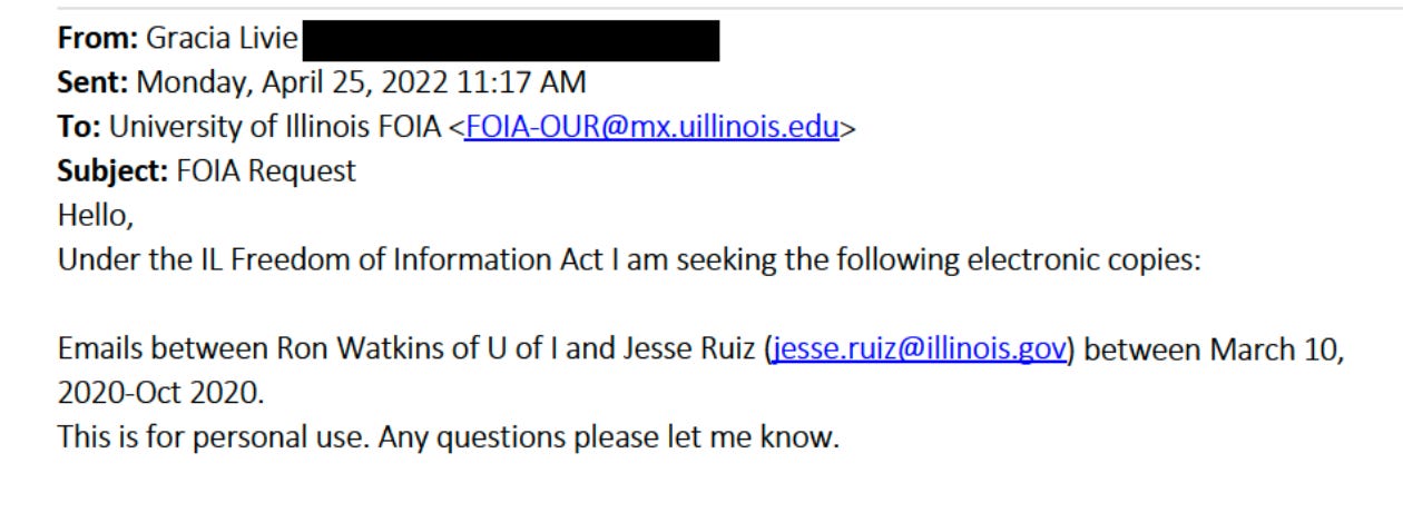 This much is clear: 1) U of I contacting the Governor’s office over this is a bad look, and 2) Gracia Livie was asking for emails that made (or were could make) someone nervous.