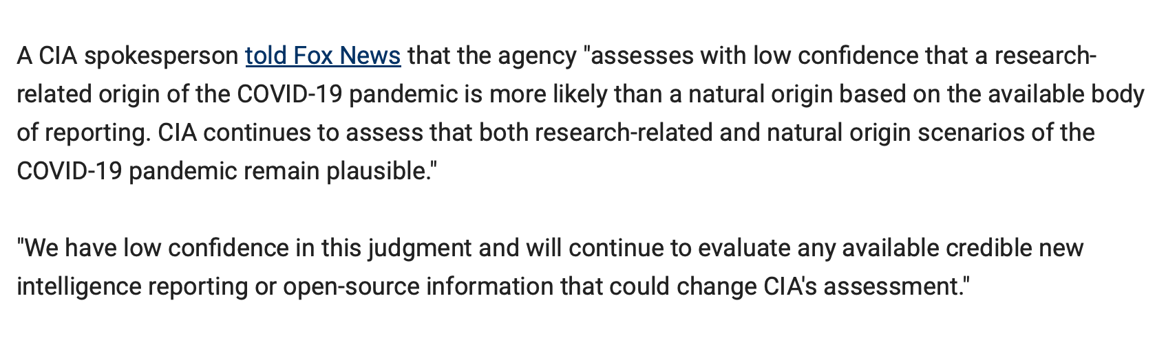 Added 28 Jan 2025: The FoxNews headline is correct: “New CIA boss Ratcliffe says Biden-era report backing lab-leak theory released to 'restore' trust”. This is what Ratcliffe said, but Ratcliffe is wrong: The report (at least the summary assessment sent to media) did not say anything about a lab-leak theory. While FoxNews should be more critical of the conflict between Ratcliffe’s statements and the CIA assessment, they did exercise some caution in saying, “The CIA now appears to slightly favor the lab-leak theory that suggests gain-of-function research at the Wuhan Institute of Virology in Wuhan, China may have directly contributed to the virus.”