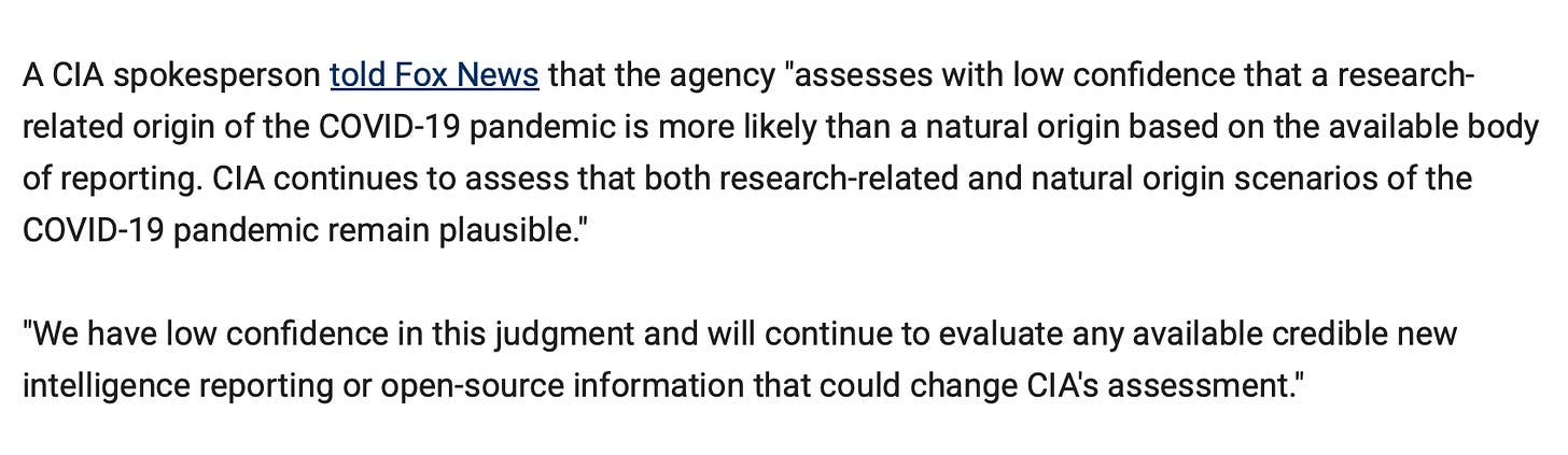 This is a follow-up to my evaluation of the CIA’s ‘low confidence’ assessment regarding the origin of the COVID-19 pandemic. I have made several updates since publication, which are in the article itself: