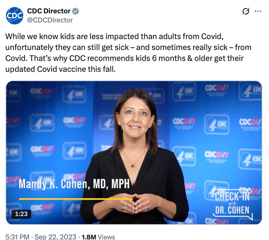 In September 2023, then-CDC director Mandy Cohen posted a message on X, promoting COVID boosters and flu vaccines for children 6 months and older.