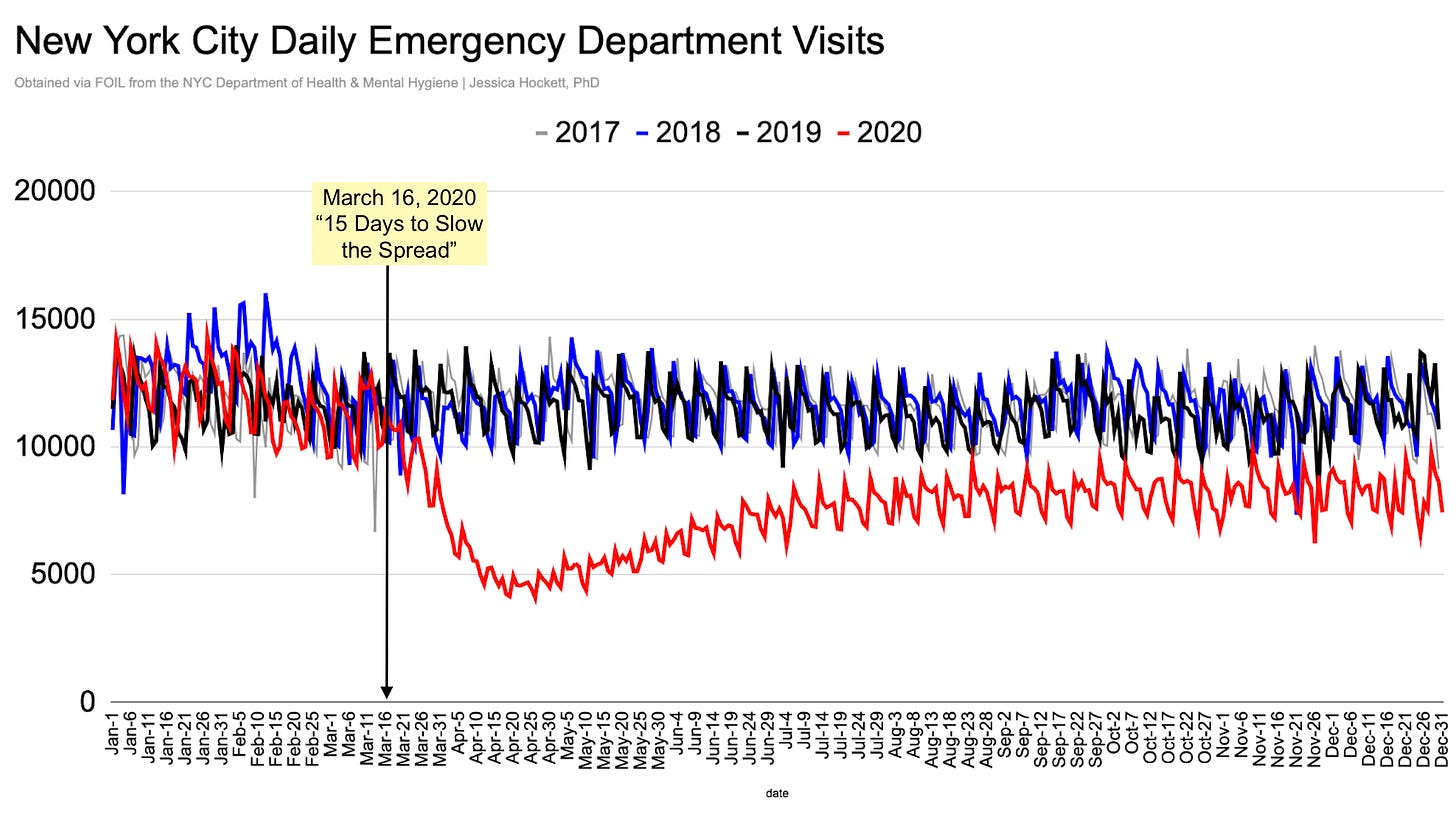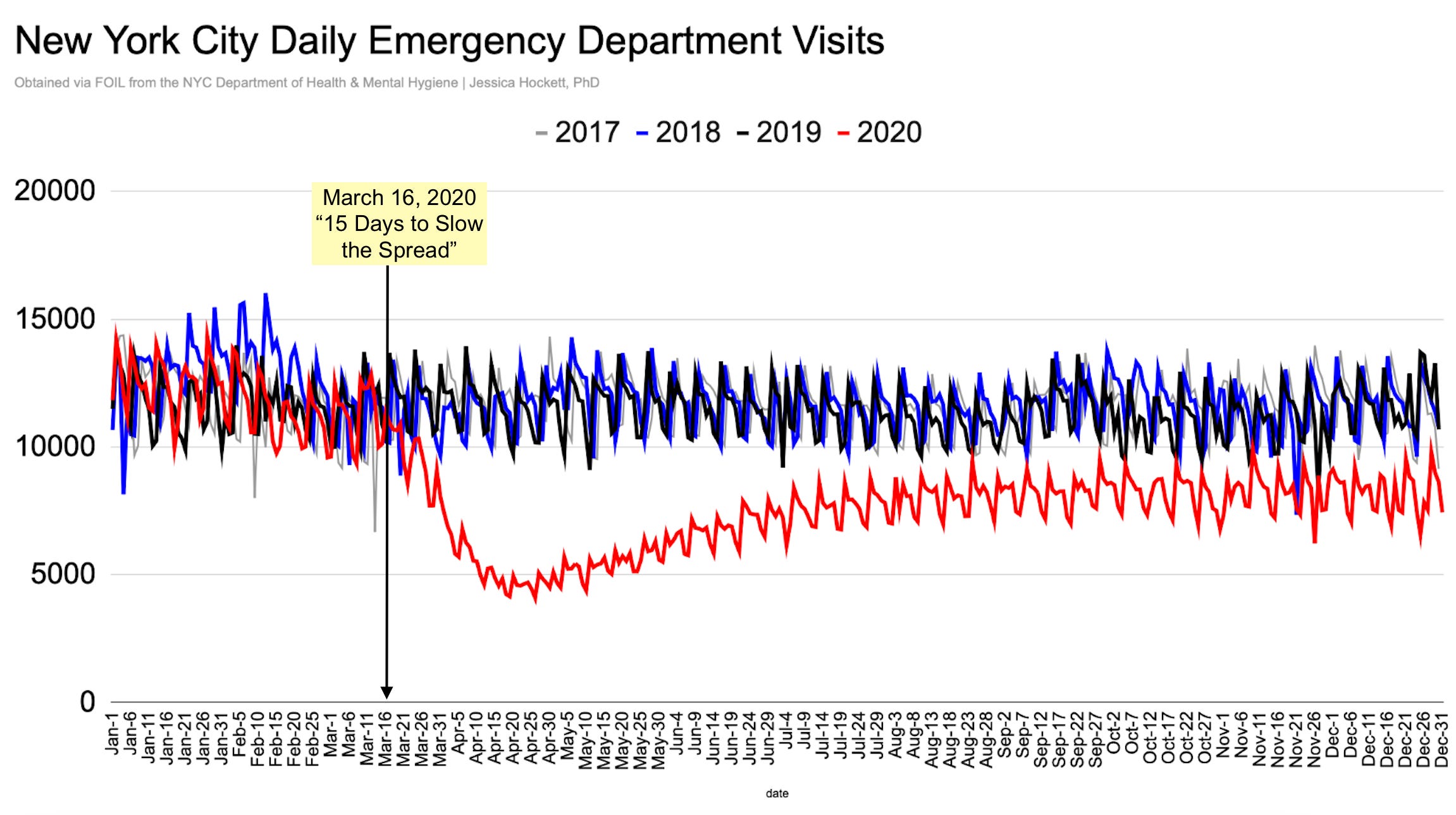 It’s also hard to ignore that the decrease in ED visits citywide occurred simultaneous to an increase in 911 calls & ambulance dispatches, and a redirection of lower-acuity calls to telemedicine beginning April 1, 2020.15 These patterns contradict the perception that people were unwell but afraid to see a doctor, as most people who call for medical help expect that they or the person on whose behalf they’re calling could be brought to the hospital. Orders for paramedics to keep people away from (purportedly) overwhelmed hospitals - and to refrain from using normal lifesaving measures with patients in cardiac arrest - challenge Feldman & colleagues’ implication that the patients themselves were to blame for the drop in ED visits.
