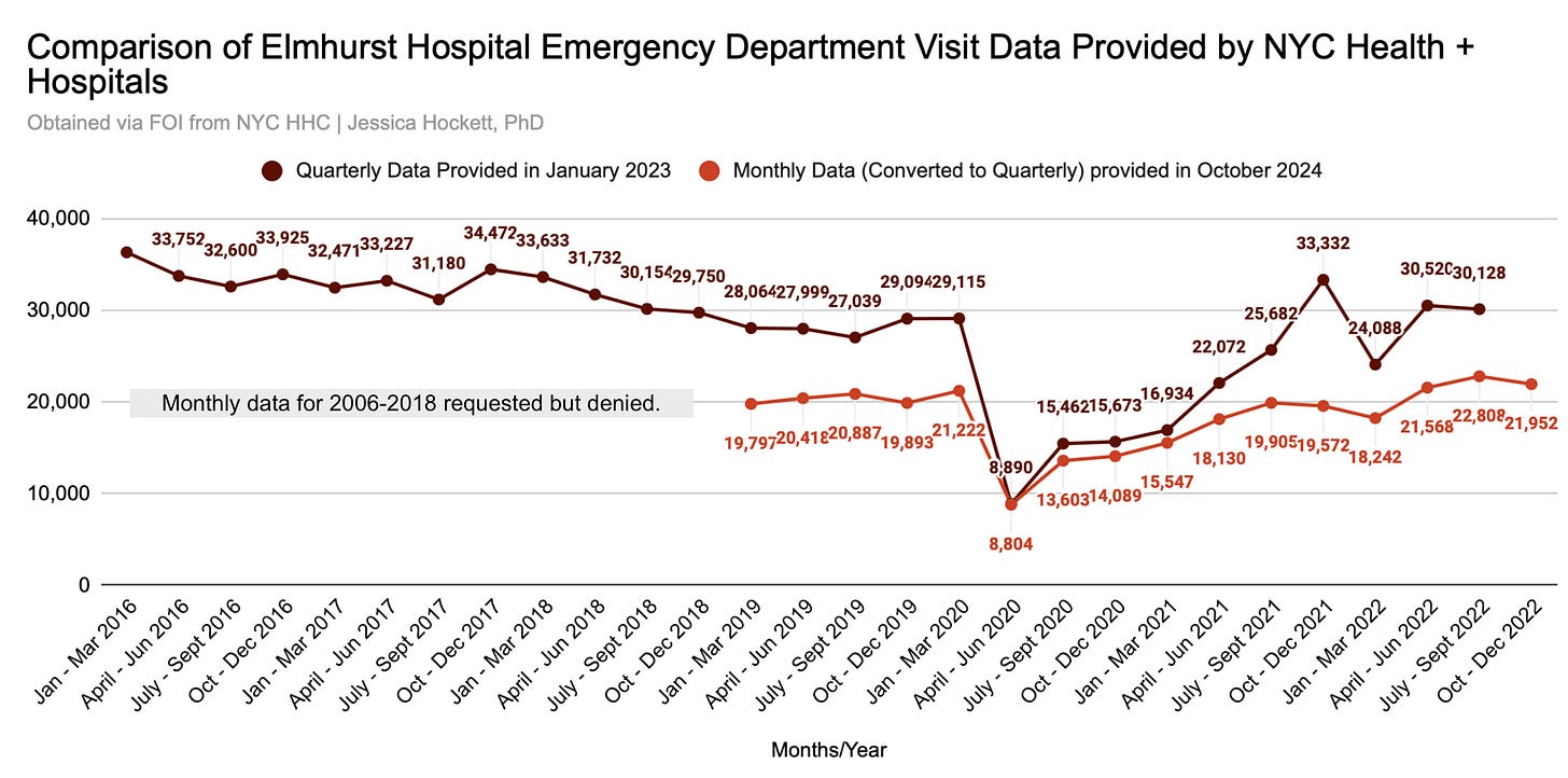 There are also discrepancies between the monthly data from HHC and data reported in archived reports in the New York Statewide Planning and Research Cooperative System (SPARCS), accessed in 2023 and reported in Figure 10 in Does New York City 2020 Make Any Sense? and between SPARCS reports currently posted for Elmhurst and those accessed in 2023. I may come back to those discrepancies in another post. For now, it’s enough to say that myriad sources do not agree and may not be representing the same data or using the same definitions. UPDATE, 11/13/24 - I’ve now written about the discrepancies: https://www.woodhouse76.com/p/discrepancies-between-monthly-and
