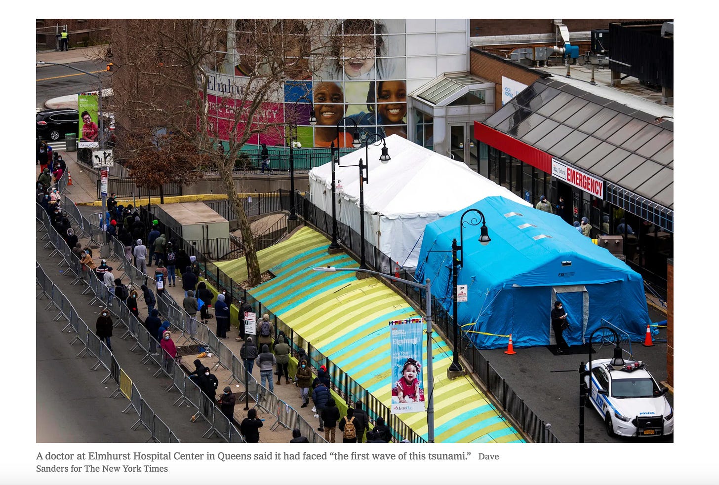 The article mentioned one tent at Elmhurst dedicated to COVID-19 testing “by appointment only,” opening on March 20th. The Feldman study implies there were two tents, erected to meet demand created by many sick and/or worried patients flooding the hospital, with testing in the tent beginning on March 18th. (The New York Times photo published the following week does show two tents in front of the Elmhurst emergency department entrance.)