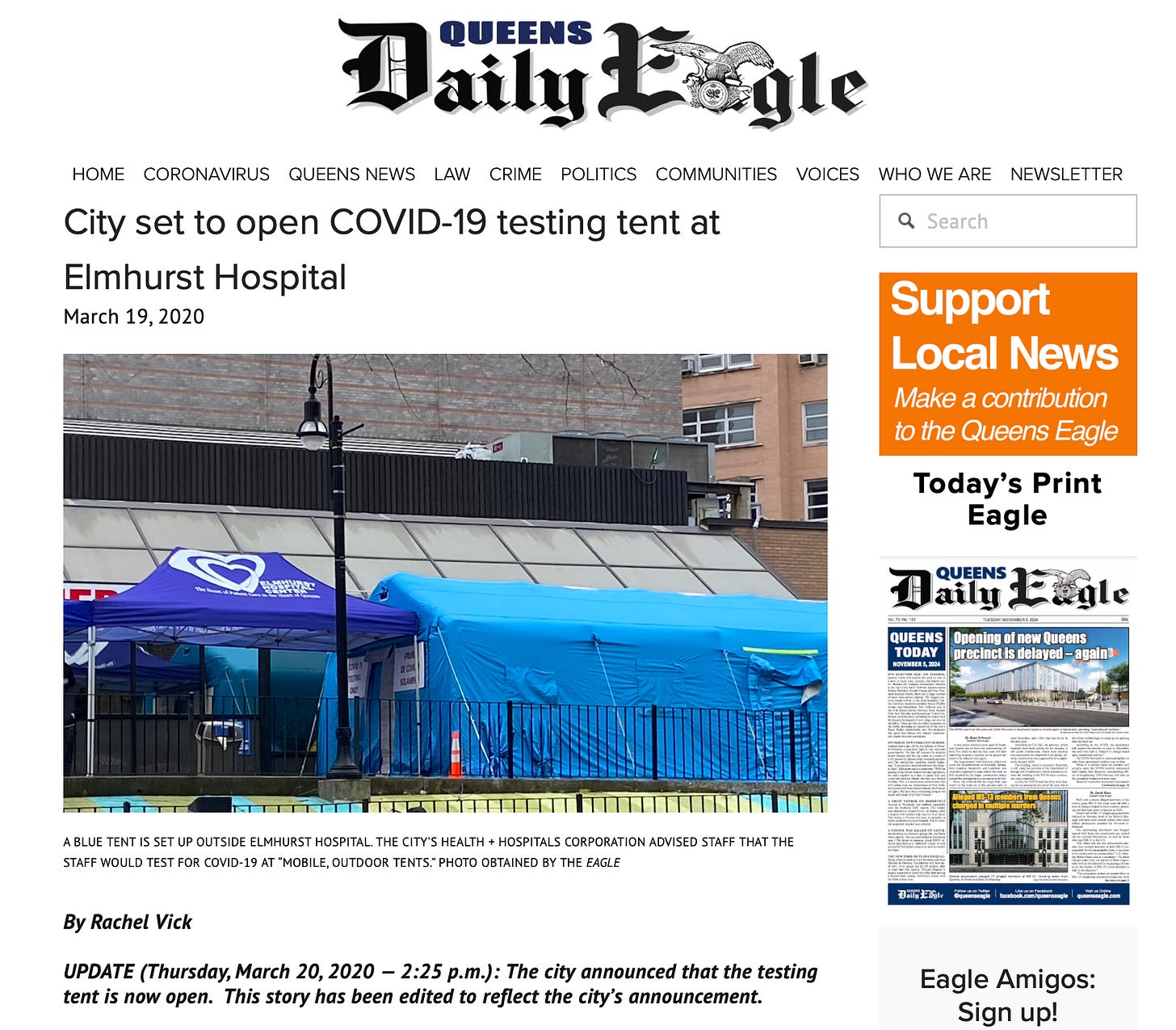 For example, details in a March 19, 2020 Queens Daily Eagle story about the timing and use of tents at Elmhurst and other hospitals paint a picture of relative calm versus an emergency in progress.