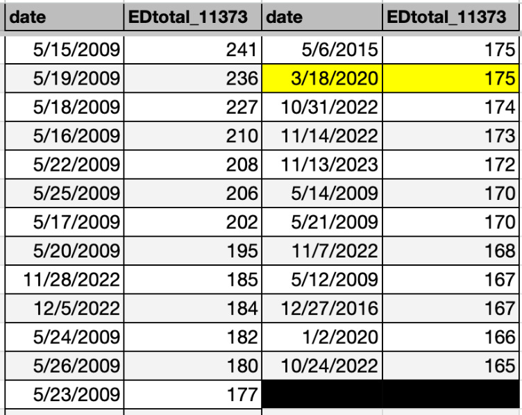 I then hit a “bump in the road”: Comparing the data I obtained from DOH with the data reported by Feldman et al, I later realized the zip code data is resident data, not hospital data.3 An email exchange with the DOH records officer confirmed this fact and means the graphs in my Twitter thread reflect the ED visits of people who live in the Elmhurst zip code (neighborhood), regardless of whether they went to Elmhurst Hospital or to another hospital in the city. Anyone who lives in another neighborhood and came or was transported to the Elmhurst emergency department is not shown.4 This may not matter for the overall trend but could make a difference for volume and magnitude.