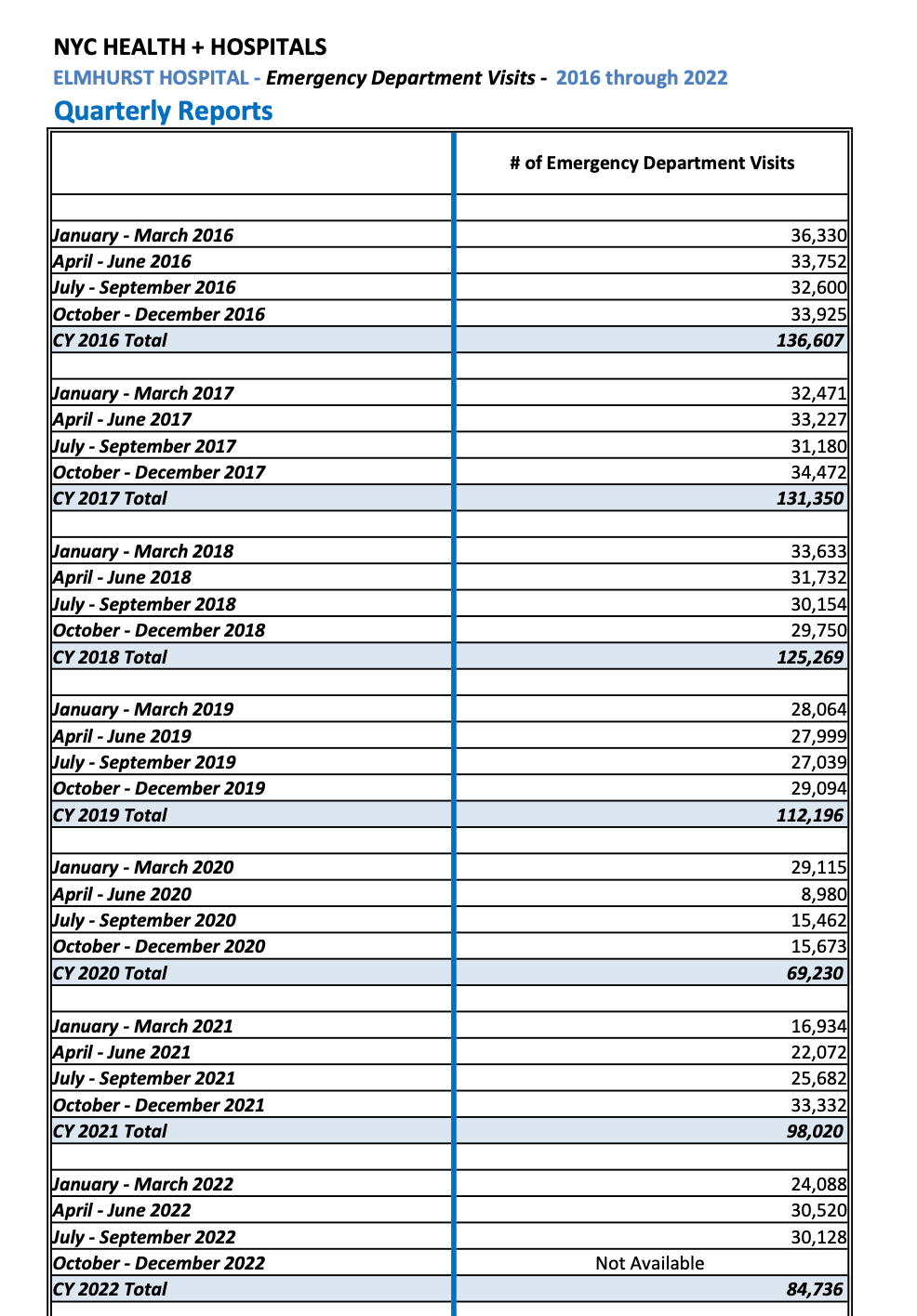 NYC Health + Hospitals performed a search for daily emergency department visits for Elmhurst Hospital, Queens, from 1/1/2016 - 12/31/2022, but no such records were found. While NYC Health + Hospitals does not maintain emergency department visits in a daily format as you requested, it does maintain records for emergency department visits in a quarterly format, and a record of those quarterly visits has been attached here. NYC Health + Hospitals has not yet summarized the last quarter of CY 2022, but data for all other quarters covering the time period requested are included in the attached.