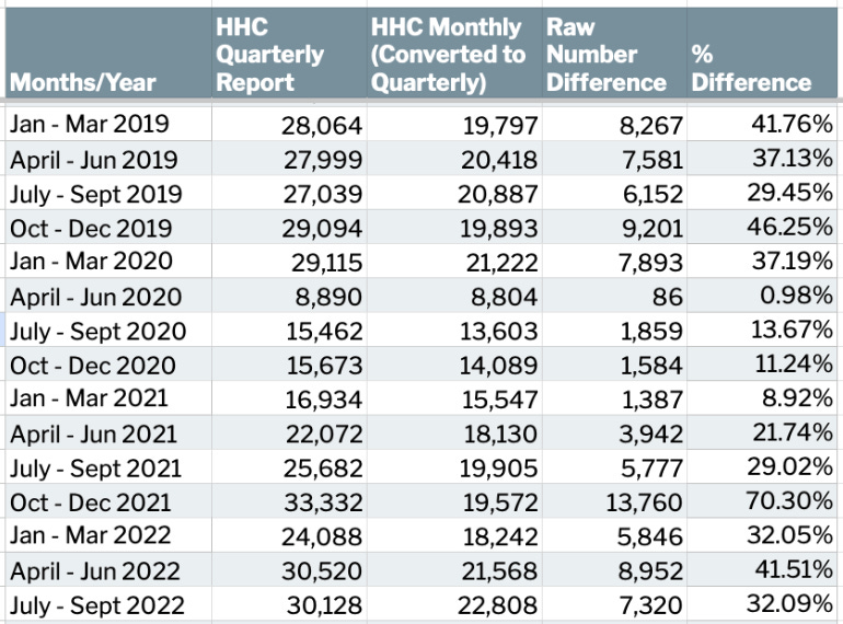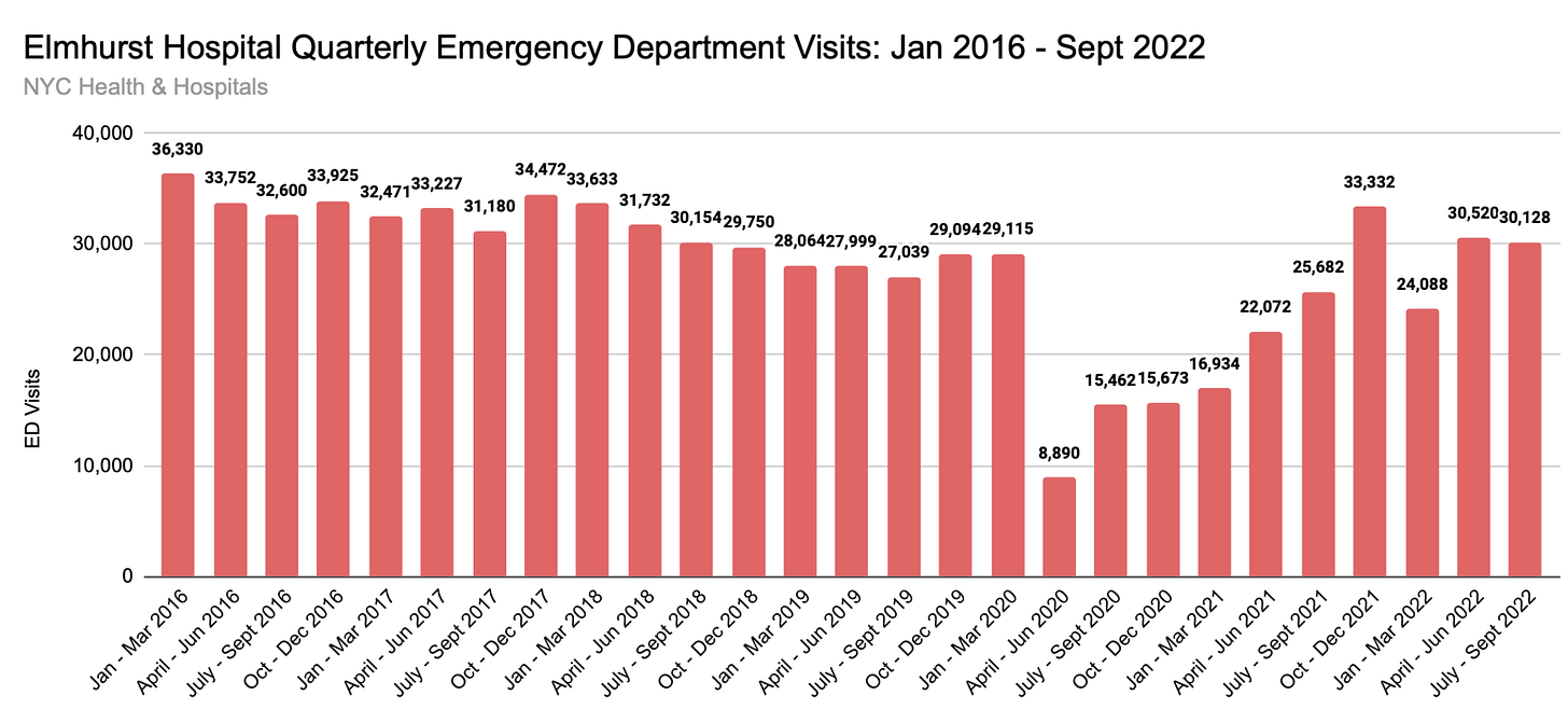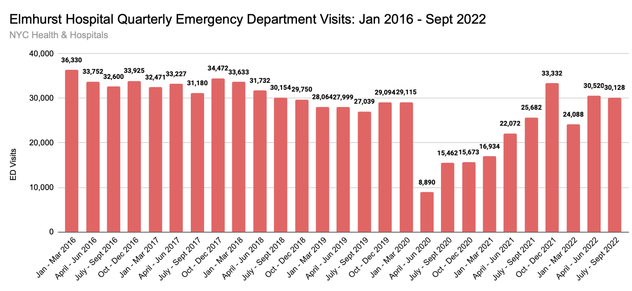 It’s difficult to explain gaps of 9%-70%, or why the gap lessened for four quarters in a row before widening again. The difference for October - December 2021 is staggering, with the HHC quarterly report showing 13,760 more ED visits for Elmhurst than the monthly data HHC provided to me recently.