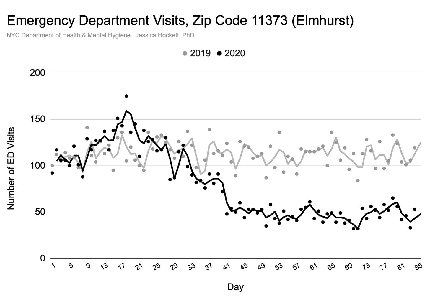 The New York City Department of Health maintains daily emergency department visit data for each zip code. I had assumed the data represent visits to whichever hospitals are in the zip code. Because Elmhurst is the only hospital in zip code 11373, I thought it reasonable to consider the data a proxy for Elmhurst’s data.2