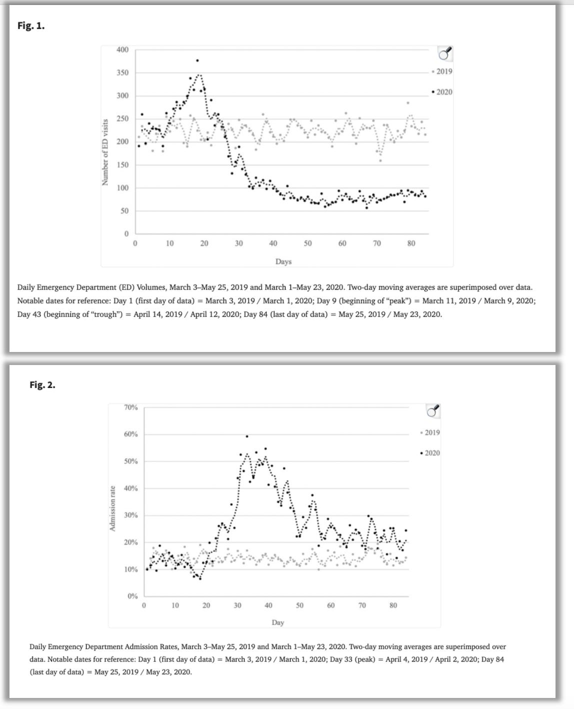 The scene presented in Feldman et al is very odd: ED visits start to rise after the pandemic declaration and peak two days after the federal “slow the spread” decree while admits remain normal (between 10%-20%), dip slightly, and then skyrocket to 60% as the ED visits hit bottom.13 Admissions to the hospital from the ED are low when visits are high and admissions high when visits are low. (Remember, this is all transpiring during an incredible death event involving the loss of nearly 500 patients in four weeks.)