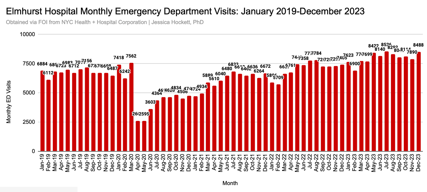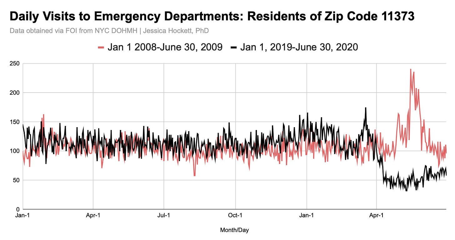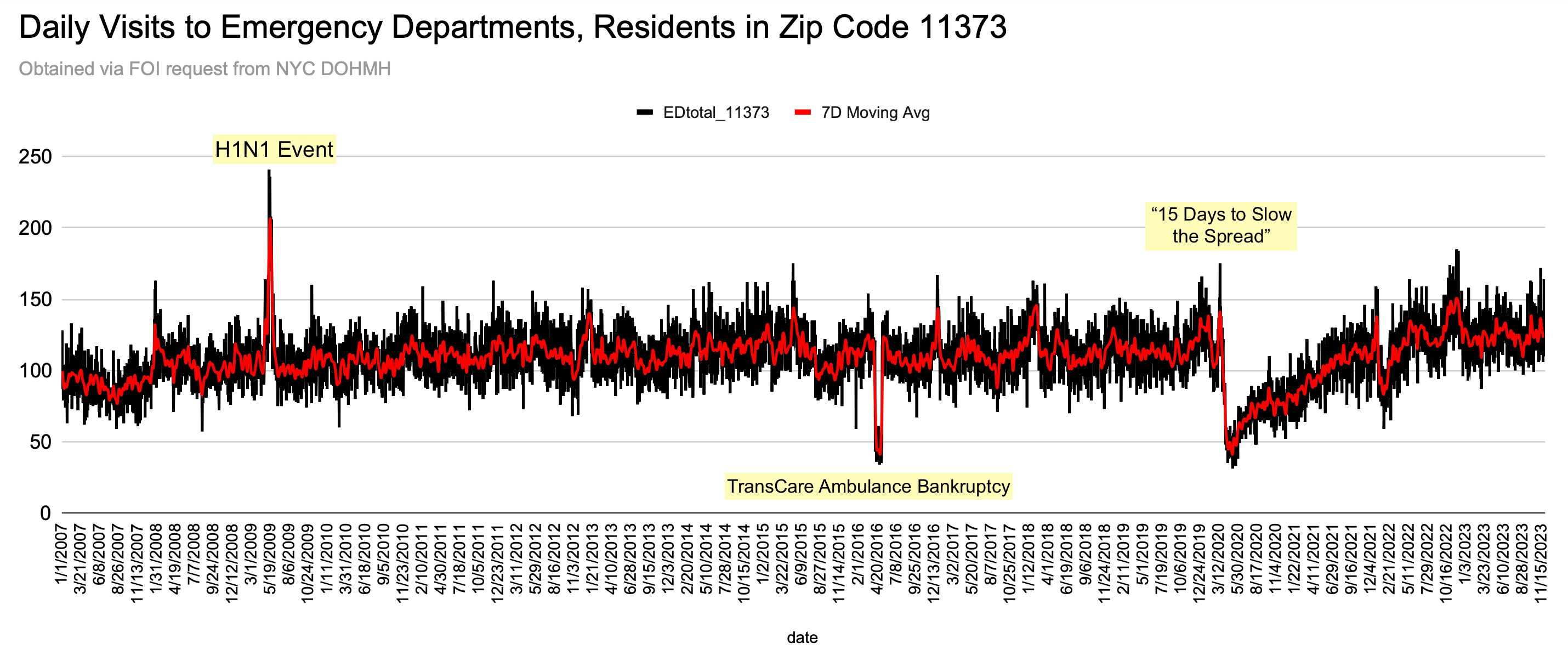 In January 2024, I asked DOH for daily emergency department visits in zip code 11373, from 1/1/2007 - 12/1/2023. I received the data in late February and shared it on Twitter.