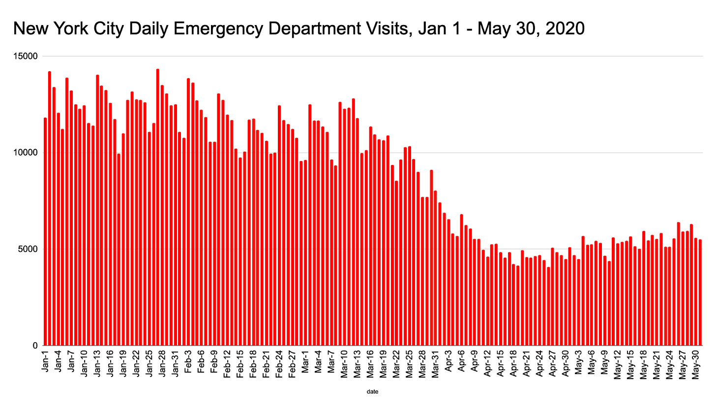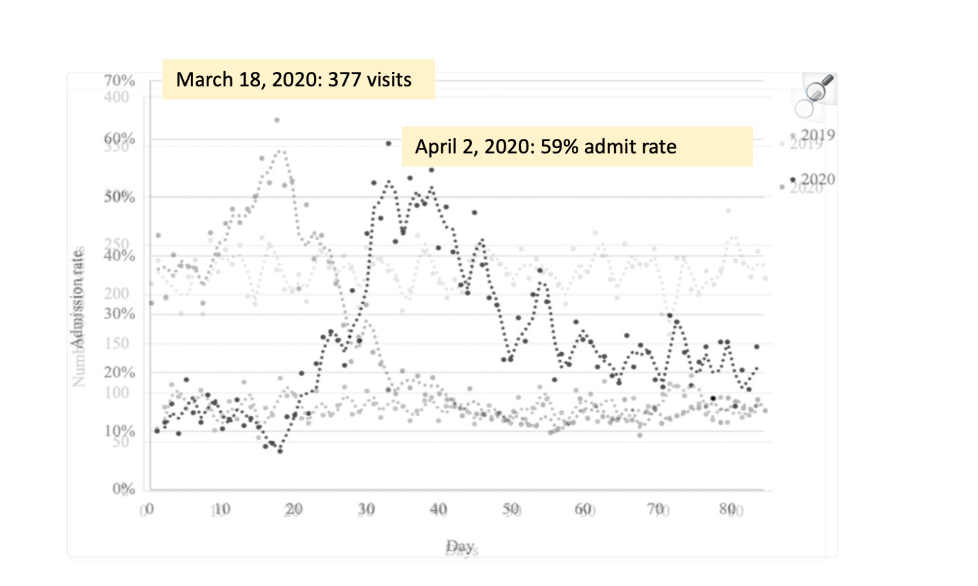 Let’s start the journey with a reminder about how busy New York City’s hospital emergency departments (EDs) were as a system in the early days of the COVID event.
