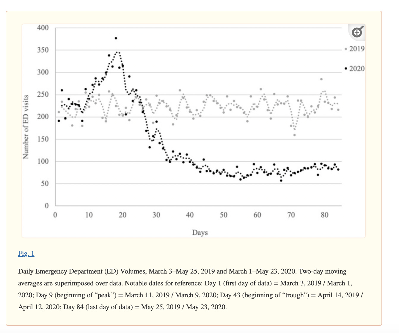 Such explanations fit with what media and officials were saying at the time and what many researchers have supposed — i.e., a few hospitals excepted, the emergency departments of most facilities were far less busy than unusual because people obeyed government orders to stay home and/or were afraid of getting infected by the virus.