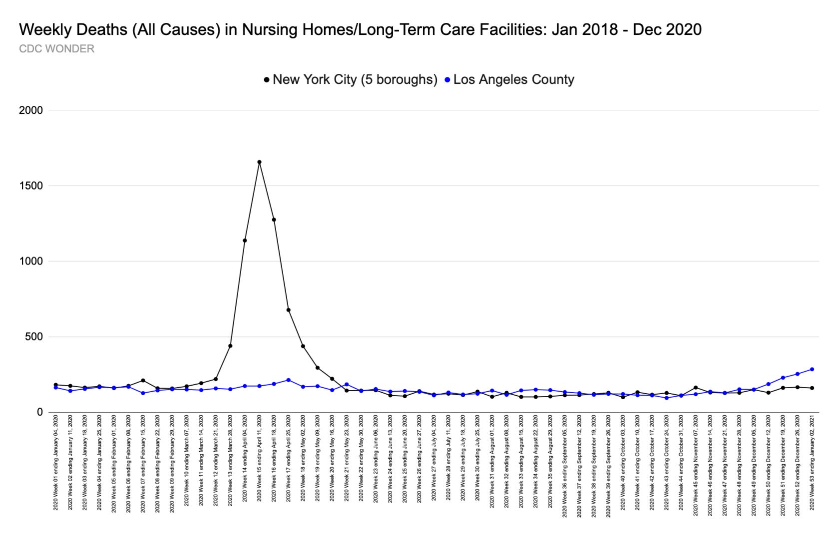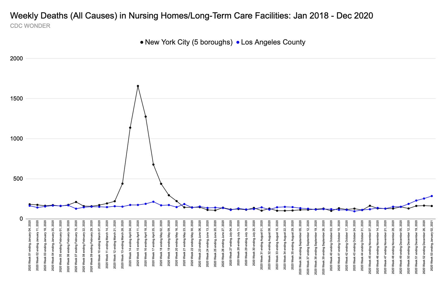 Like L.A., most of New York City’s excess death in 2020 occurred in hospitals rather than in nursing homes but a comparison (below) is illustrative of the bi-coastal absurdities we’re expected to accept.