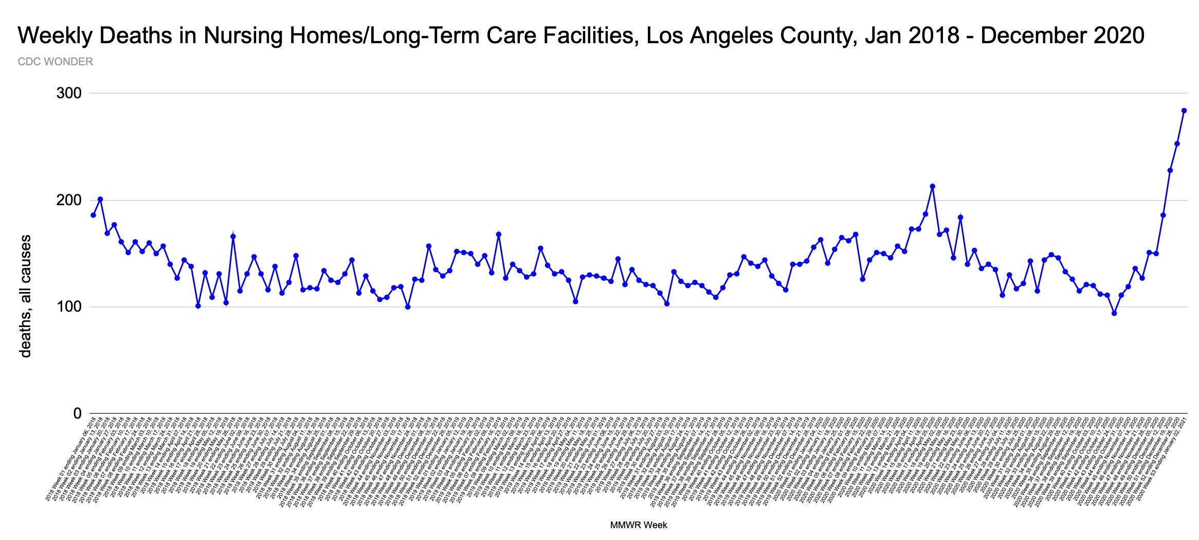 The same is generally true of spring 2020 deaths in Los Angeles County hospital inpatient, as shown here. So, even if nursing home patients were transferred to hospitals in the spring and died there, it didn’t drive excess deaths in hospitals to high levels.