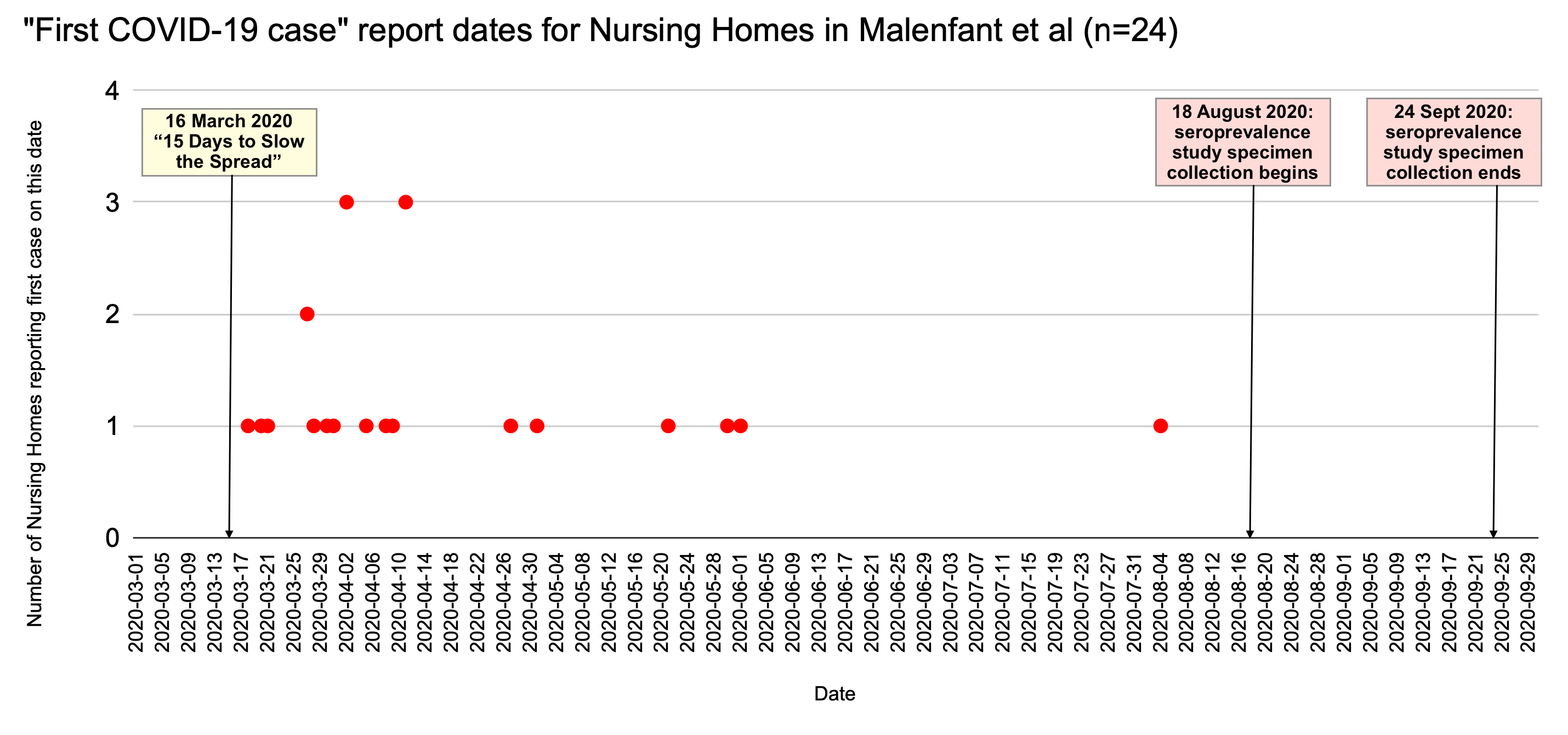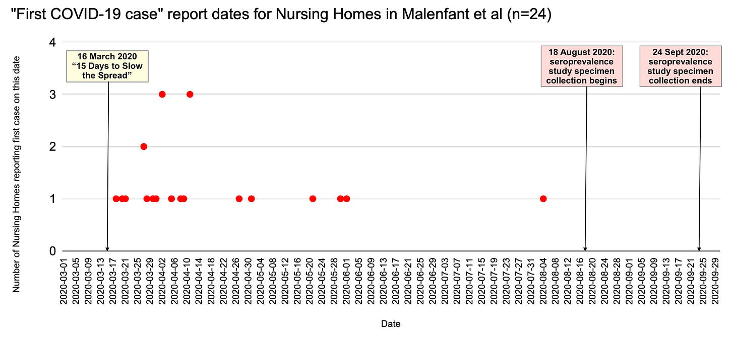 Published in 2021, Seroprevalence of Severe Acute Respiratory Syndrome Coronavirus 2 Among Skilled Nursing Facility Residents and Staff Members - Los Angeles County, August - September 2020 (Malenfant et al) collected specimen from residents and staff in 24 private nursing homes owned by a single company. The study aimed to assess the number of SARS-CoV-2 infections that were previously “undetected” due to “asymptomatic infections” and “limited testing capacity” during the initial months of the pandemic declaration.1 A total of 3,305 participants—1,340 residents and 1,965 staff members—provided varying types of samples, including nasopharyngeal swabs for PCR testing, serum or plasma for serological testing, or both, between 18 August 2020 and 24 September 2020.2