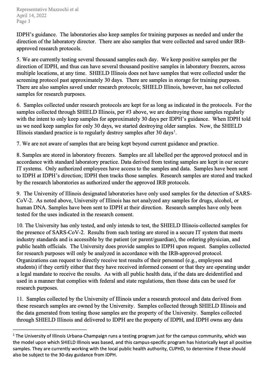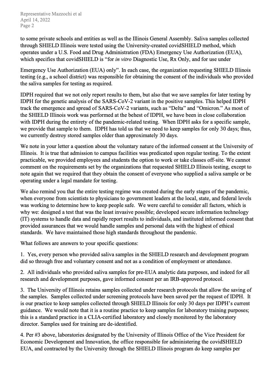Here’s University of Illinois President Tim Killeen’s response to a March 16, 2022 letter from Rep. Deanne Mazzochi & five other state legislators, regarding the school’s saliva-testing program.