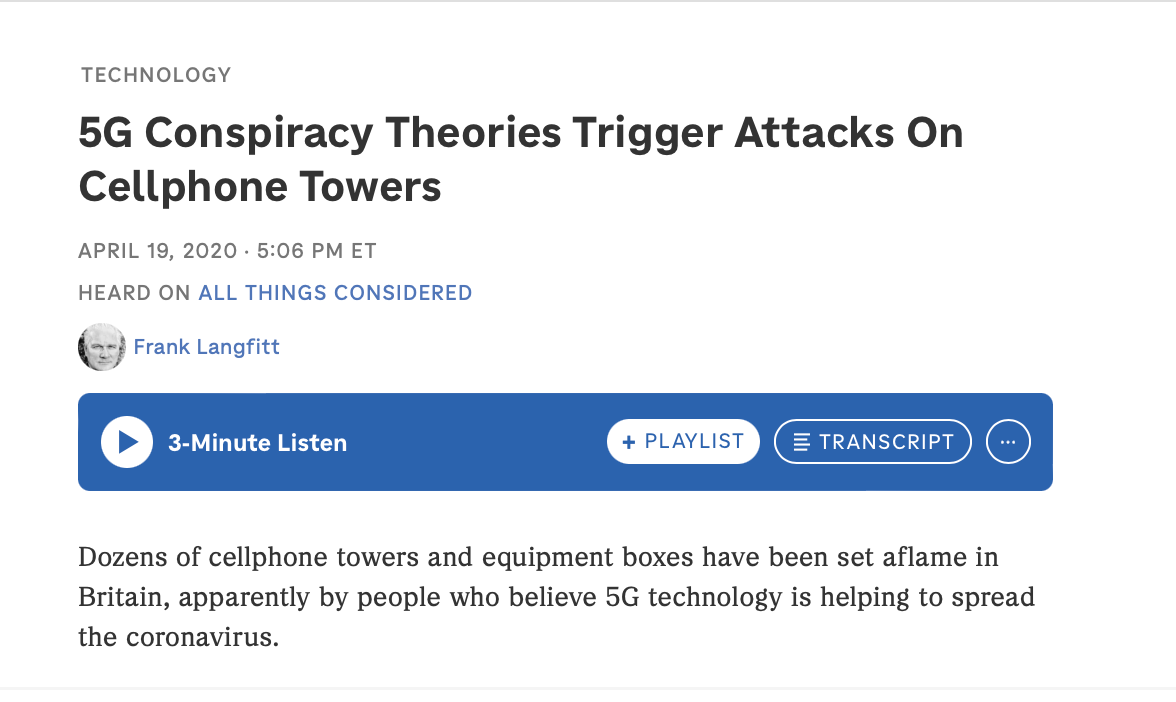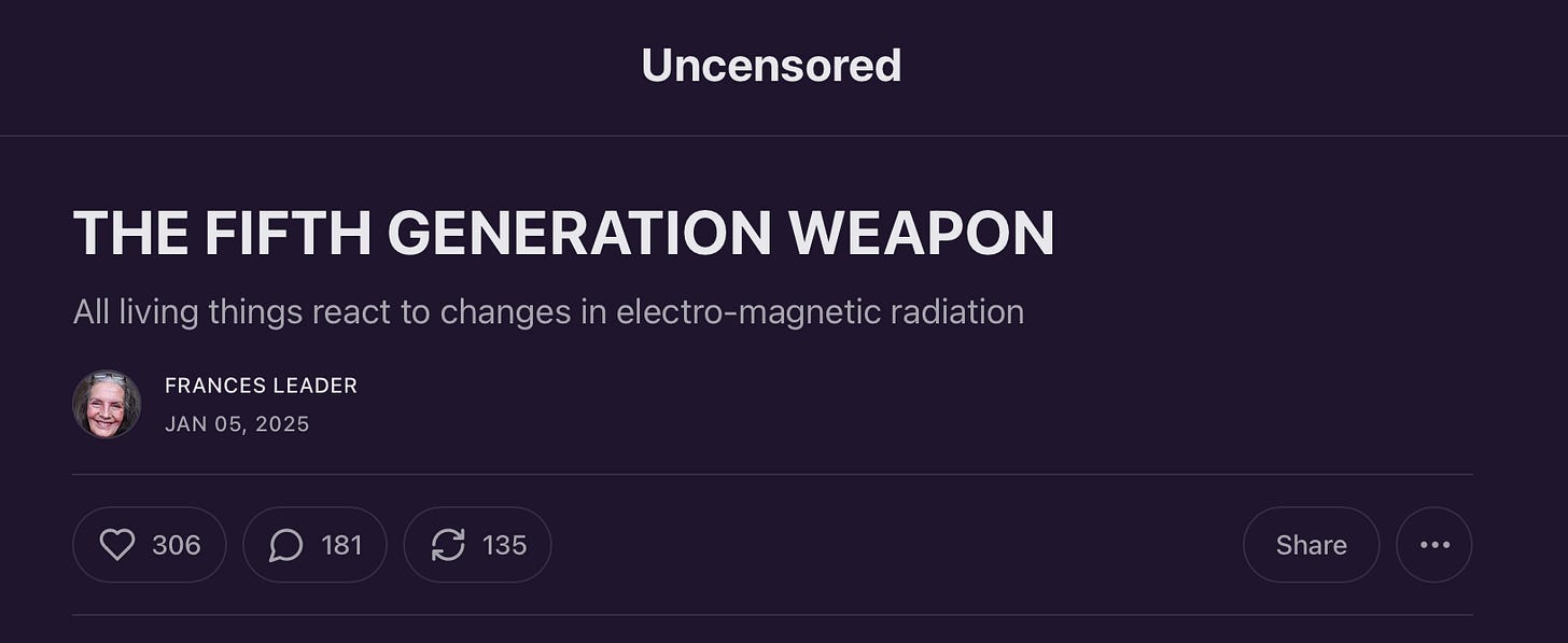 The biggest problem with 5G hypotheses regards timing - i.e., the mismatch between verified reports of people becoming suddenly ill and the launch of networks in various places. Without documentation of when these networks were activated, and some kind of obvious correlation between activation and people rushing to the hospital and/or dying — and children & animals being affected - there’s no real case to be made for a cause of symptoms classified under COVID being the effect of 5G. Similar points apply to many of the hypotheses involving chemical poisoning in strategic locations.