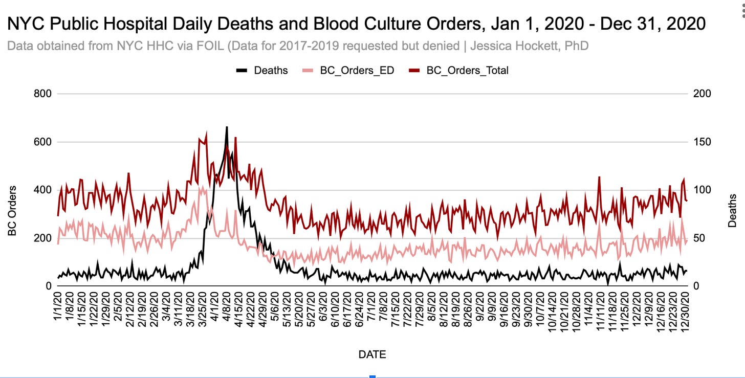 Data obtained via public records request for the daily number of blood cultures (BCs) taken in New York City’s public hospitals (n=11) show a ~50% base-to-peak increase in BCs taken after 15 Days to Slow the Spread was declared. Whether and how that relates to antibiotics disbursement is unclear.2 The peak in BC orders taken preceding the peak in deaths (all causes) by roughly two weeks suggests decisions about whether to use antibiotics were made.3