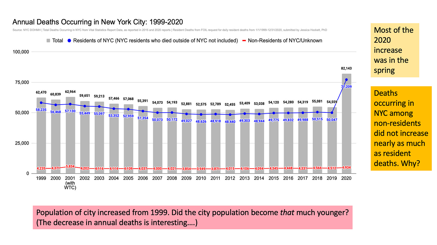 We therefore apply the simplest working hypothesis: the all-cause mortality data by time and jurisdiction (in the USA) is reliable, not fabricated or manipulated. We assume this until we see evidence that would suggest the opposite. We don’t see the points raised by Jessica as meeting that threshold. And yes, having all the death certificates would be great.