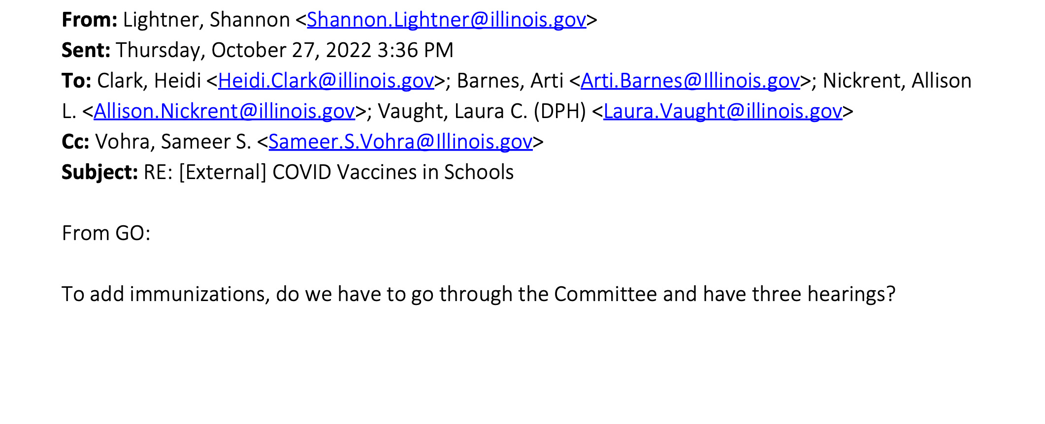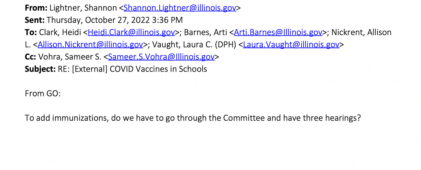 The Bolingbrook representative’s questions were to IDPH, not to the Governor’s Office. There’s no indication anyone from IPDH reached out to the Governor’s Office separately about the representative’s email, or that the Rep’s staff reached out separately to the Governor’s people.