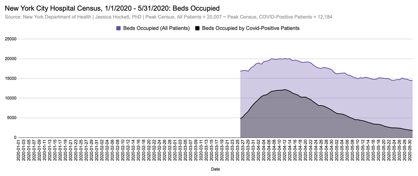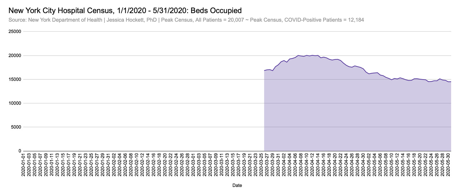 Peak census for all inpatients between 3/26 - 5/31 is reported as 20,007. Total hospital inpatient deaths from mid-March to end of May, per CDC WONDER = 19,827 (all causes). Total hospital inpatient COVID deaths from mid-March to end of May = 14,704 (U07.1, underlying cause).