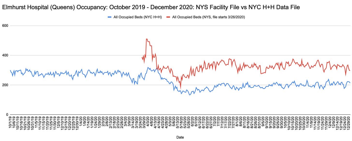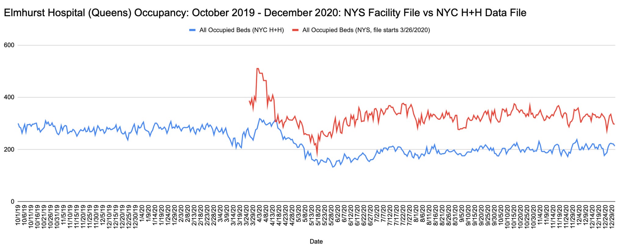 For example, the state shows 510 beds were occupied on April 2, 2020, but the health system in charge of the hospital (H+H) says 299 beds were filled with patients. Which one was it?