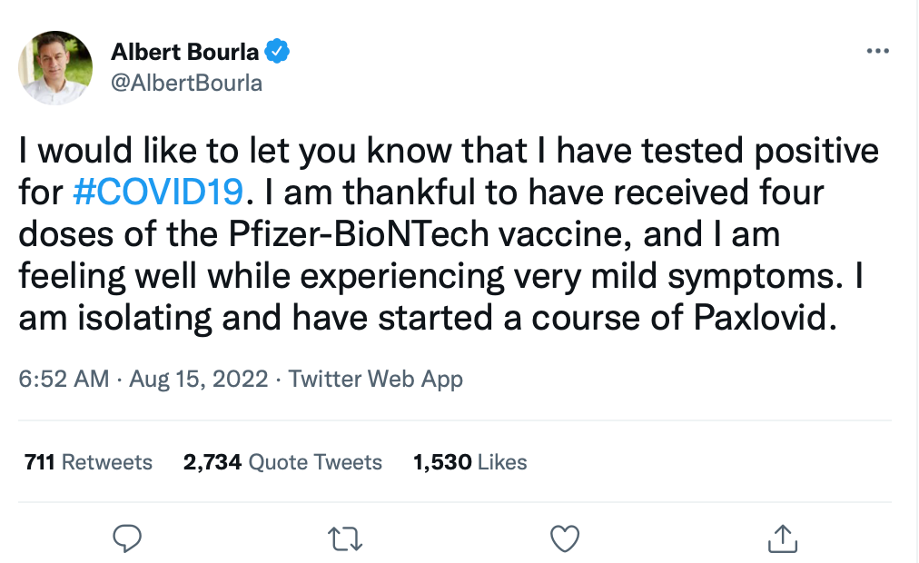 I have to ask: If Bourla’s symptoms are mild, then why did he get tested? So he could write an advertisement for how effective four doses is? (Effective enough to need Paxlovid?)