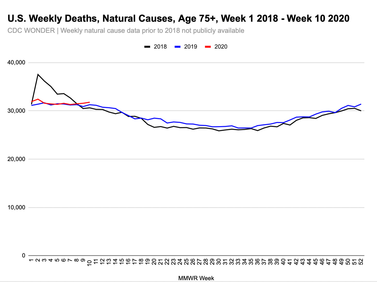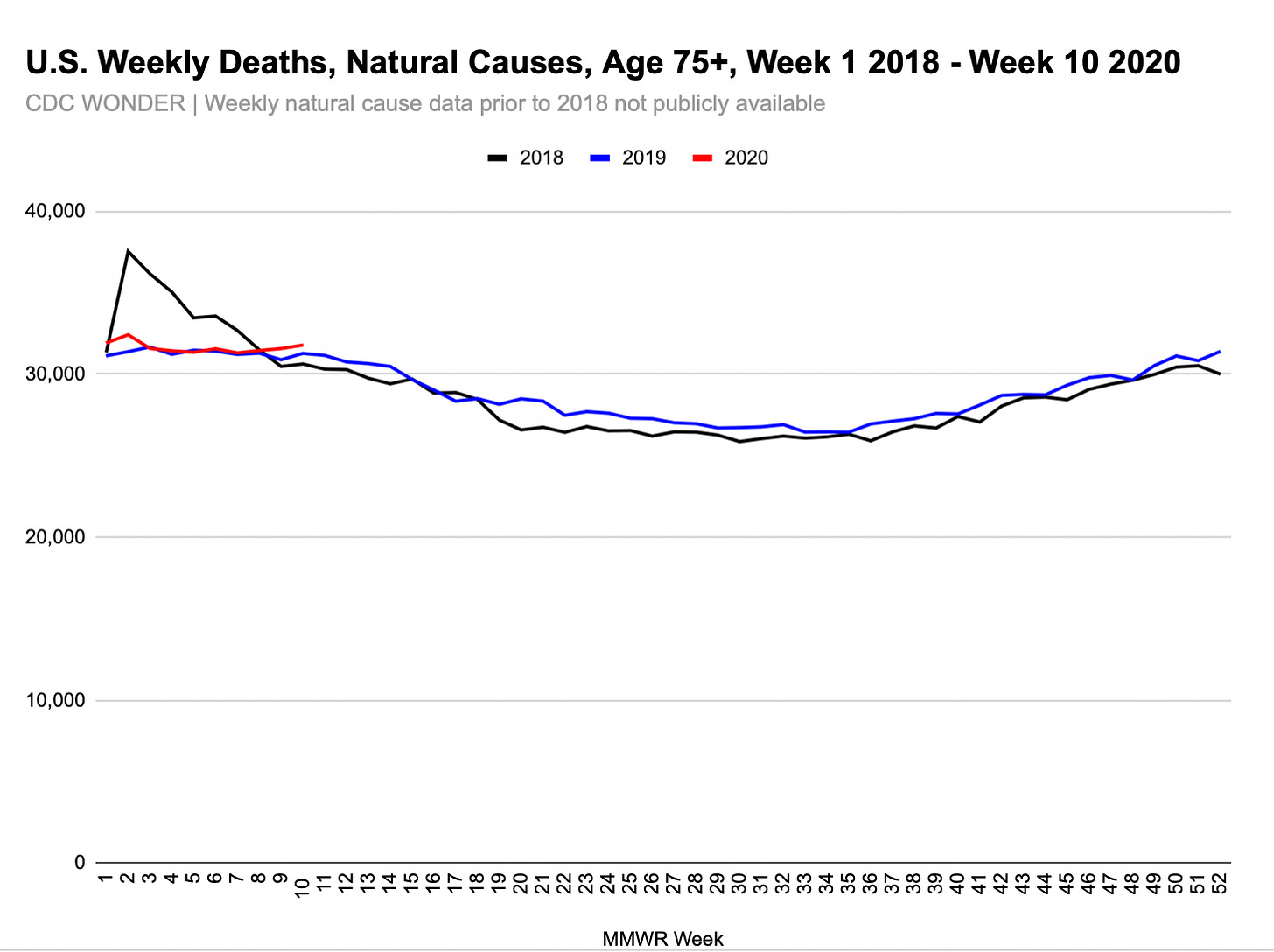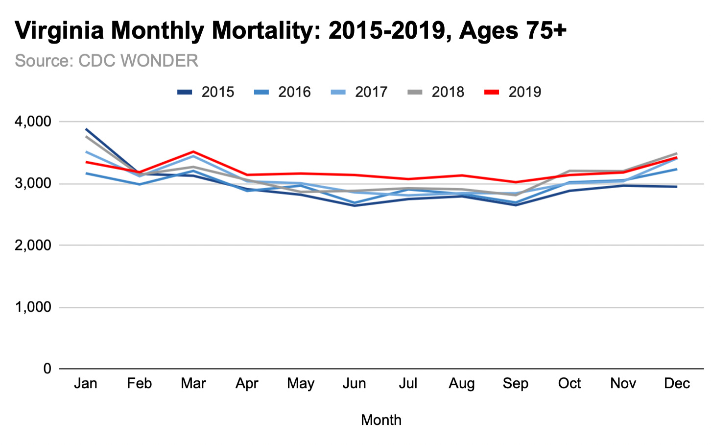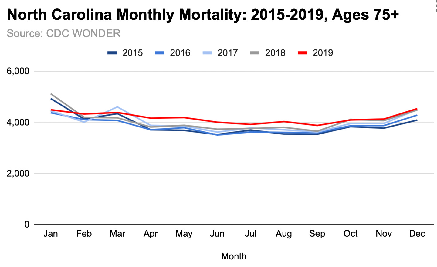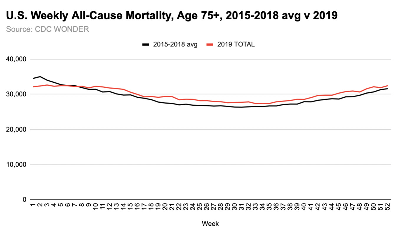 I find the 2019 off-season rise in U.S. all-/natural cause mortality for 75+ very interesting. I’ve highlighted Virginia and North Carolina, but a similar rise occurred in a number of other states too.